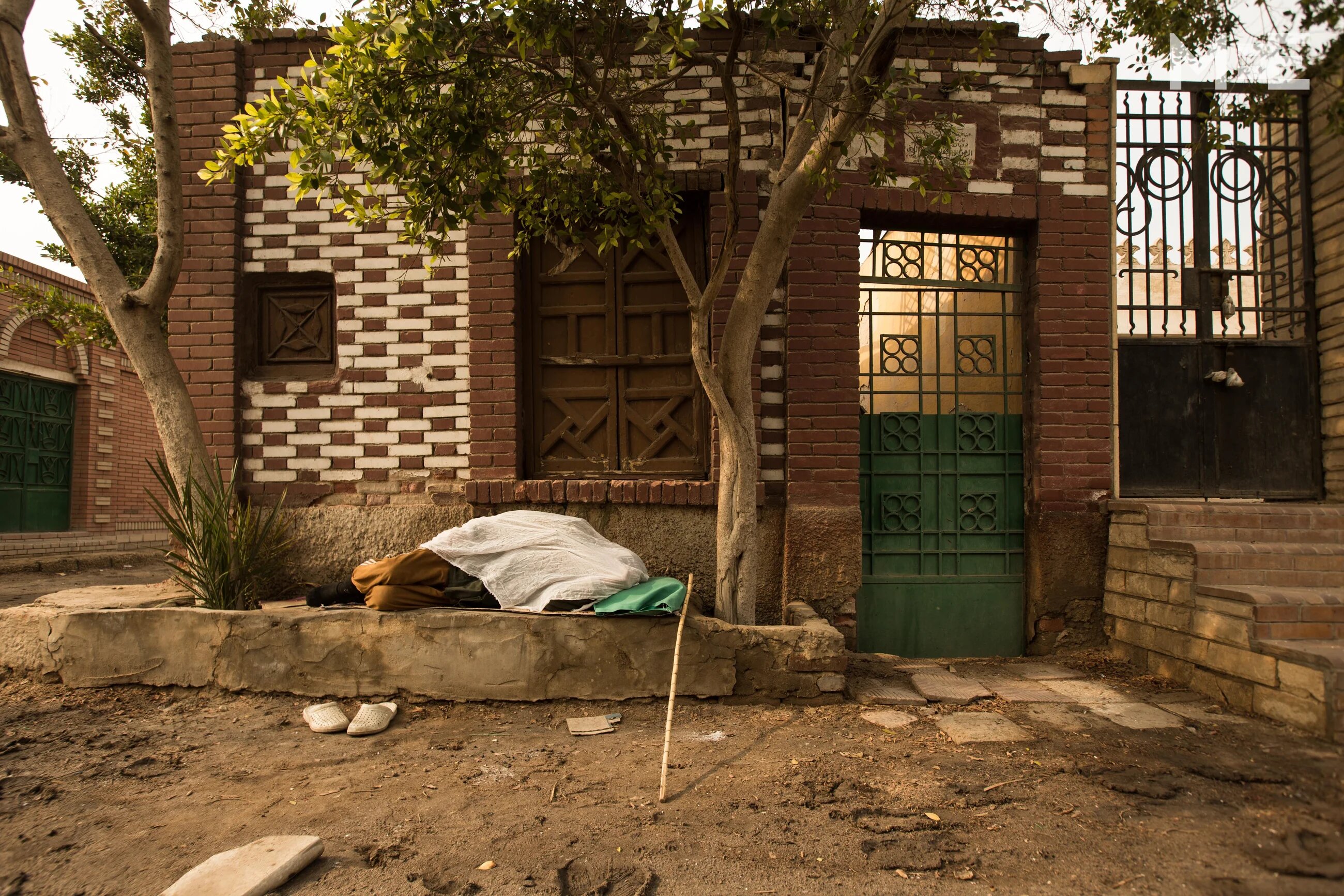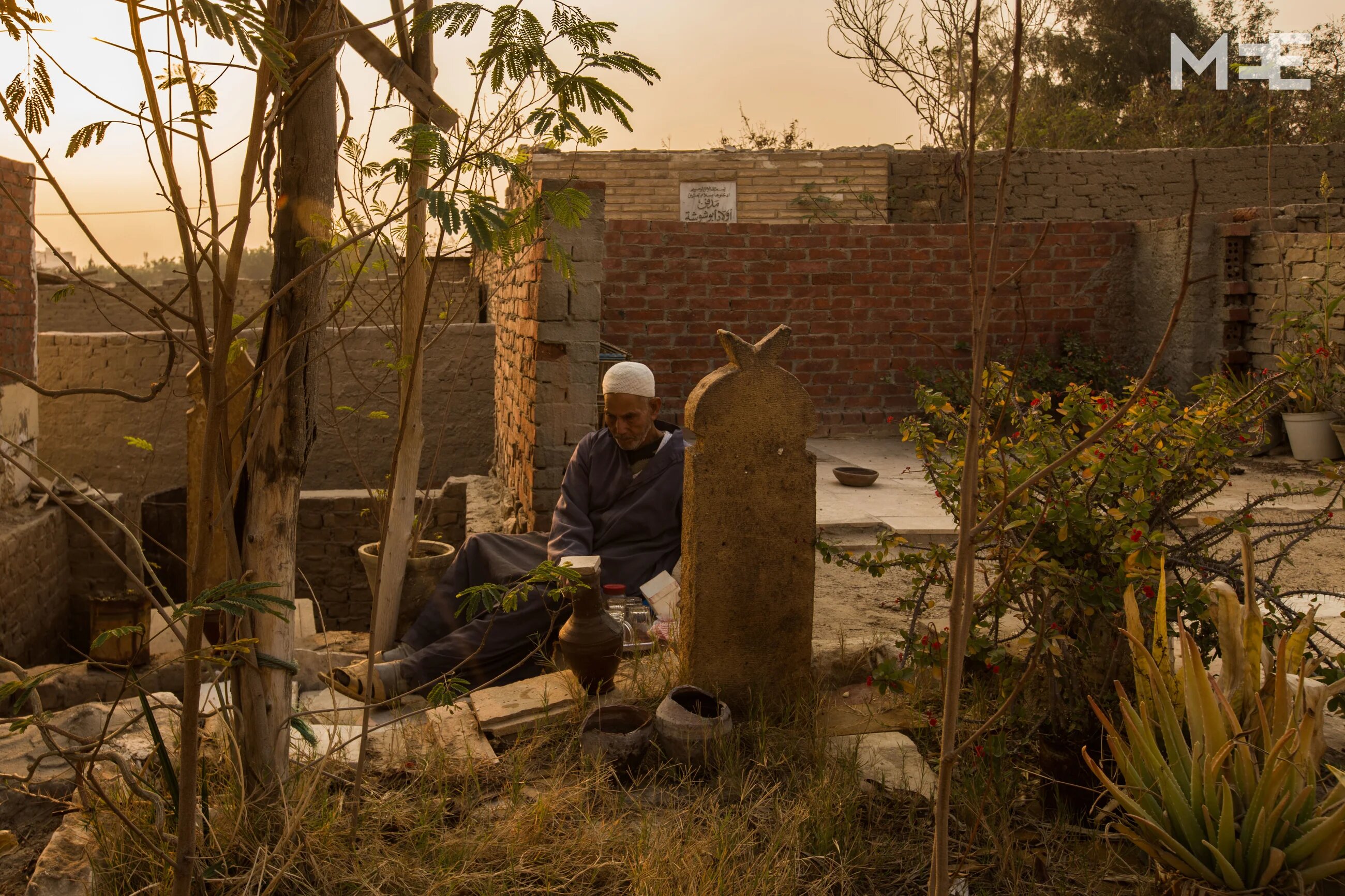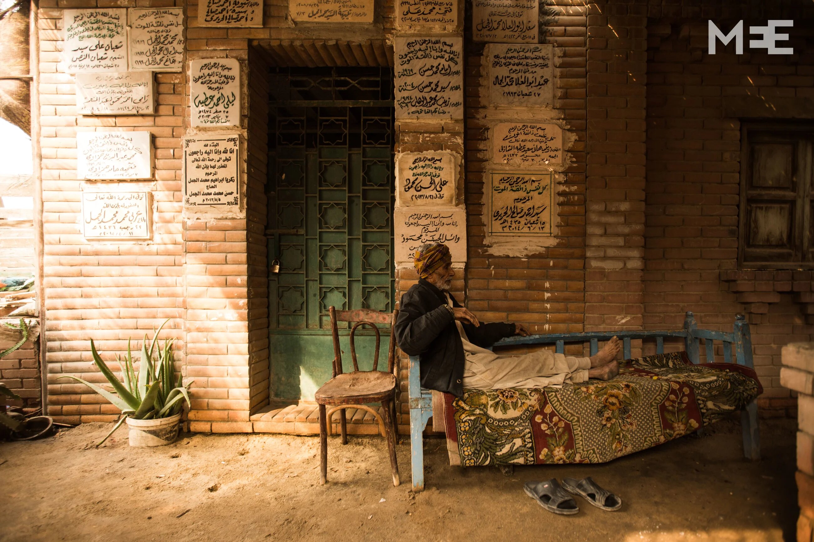 El Hajj Yasser covers his face and takes a nap in front of the tomb where he works and lives (MEE/Belal Darder)