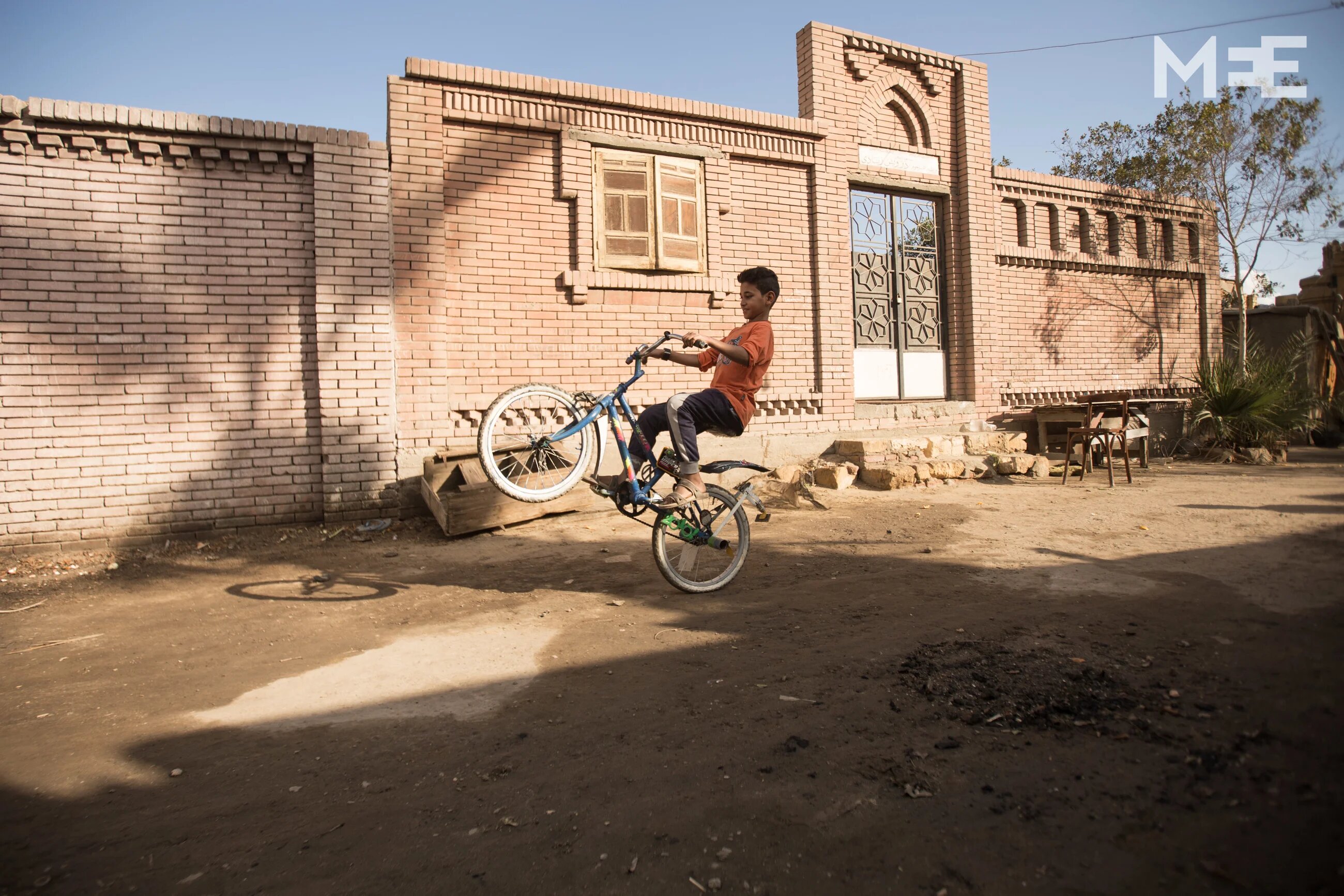 A young resident of the City of the Dead rides his bike in front of the door to one of the tombs (MEE/Belal Darder)