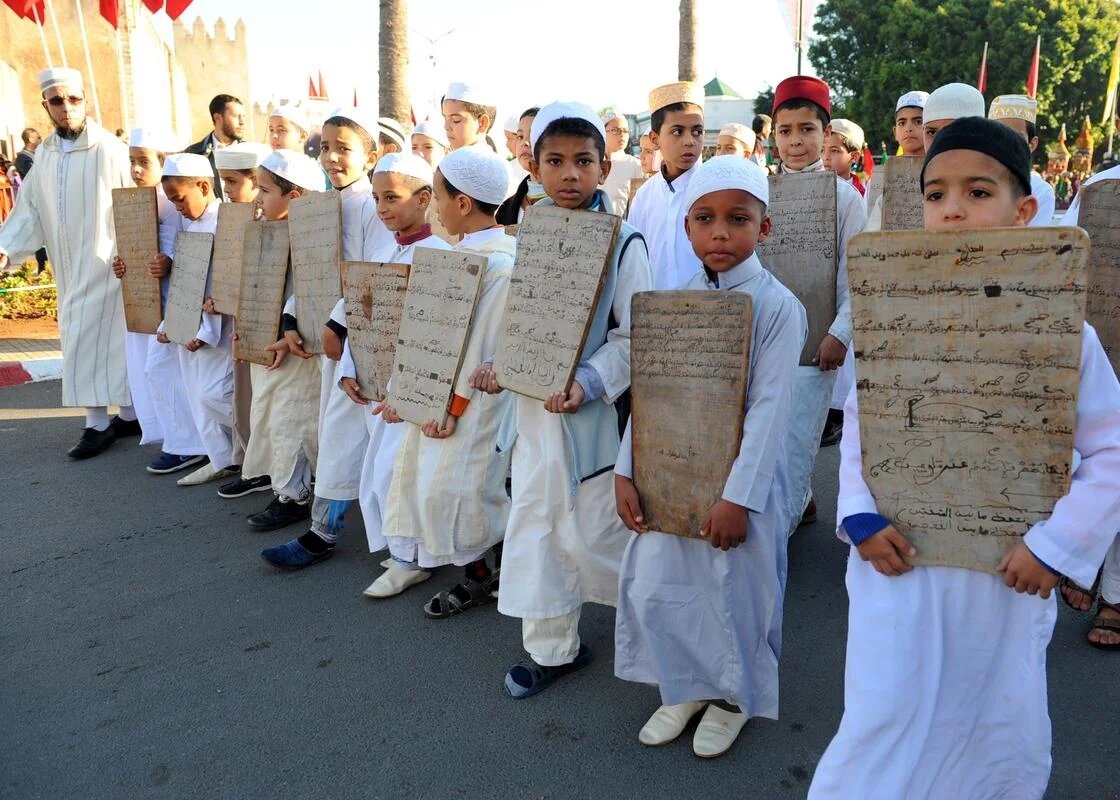 Morocco: Children hold up boards painted with verses from the Qur'an (AA)