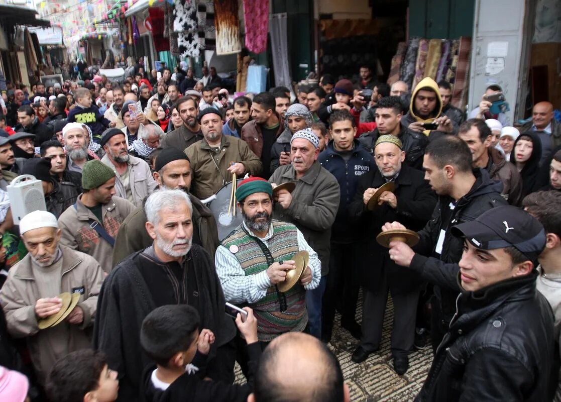 West Bank: Crowds gather in Nablus, banging drums and cymbals as they process through the streets (AA)