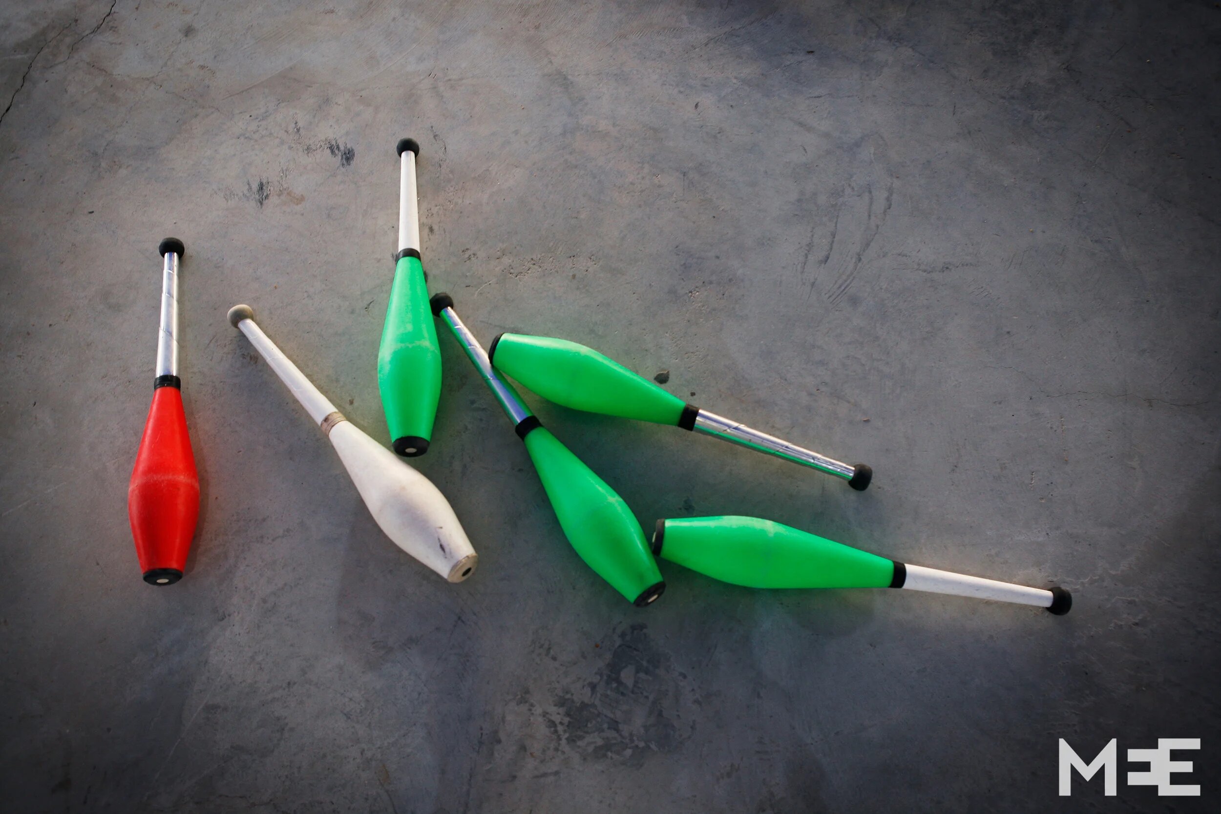 Juggling clubs on the floor of the tent at the Palestinian Circus School, Bir Zeit, Occupied Palestinian Territories (Silvia Boarini /MEE)
