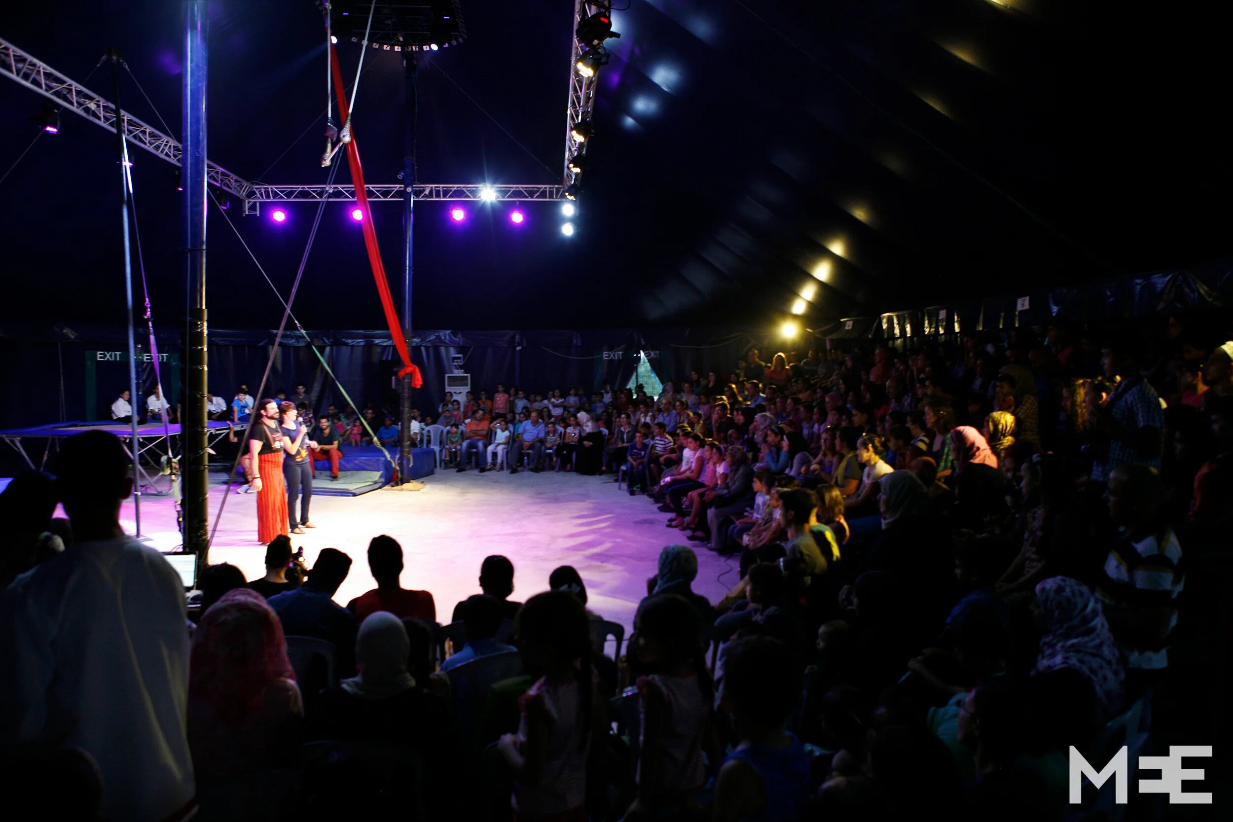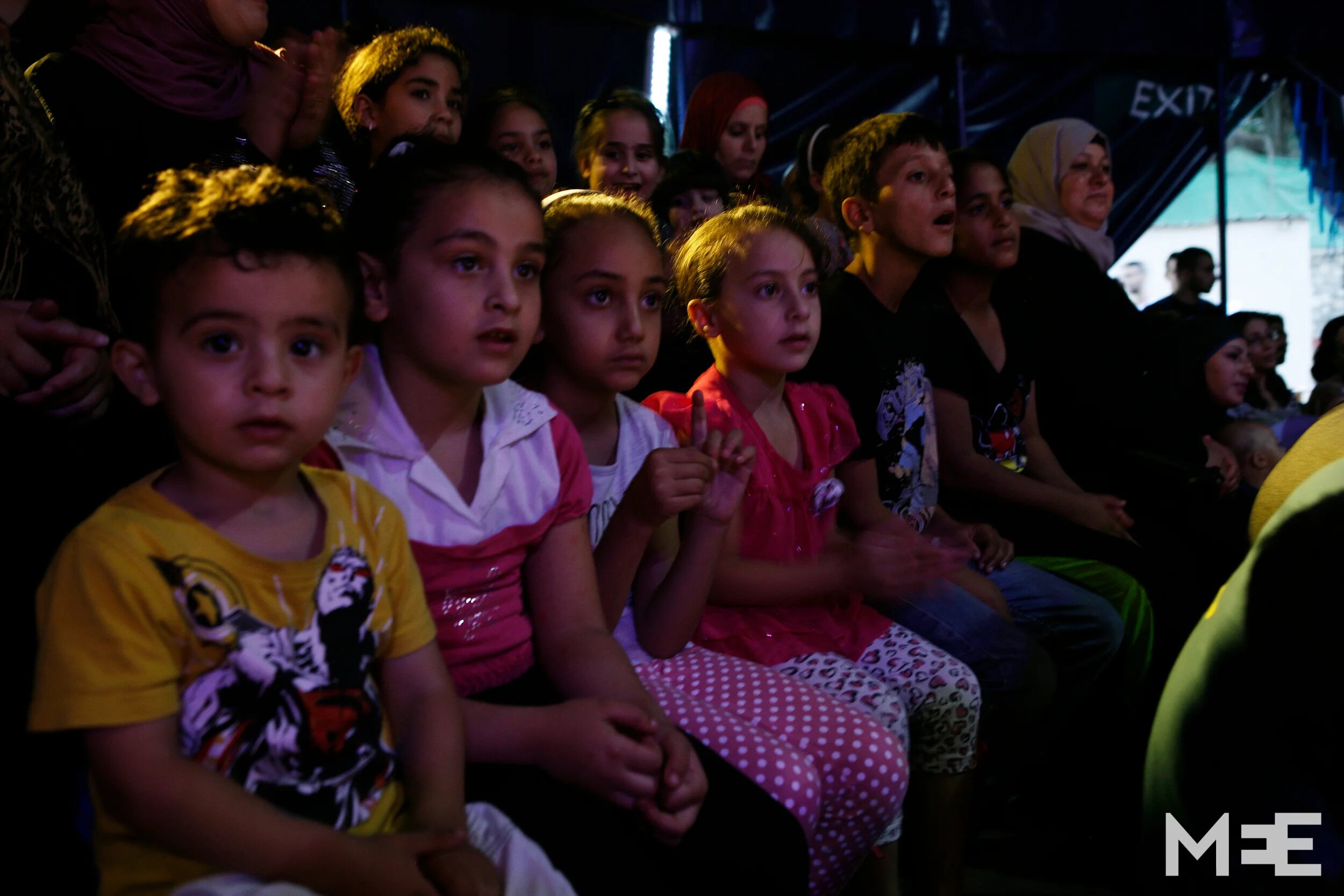 The circus school performs throughout Palestine and abroad. Here a young audience follows a show in the Bir Zeit tent. (MEE/ Silvia Boarini)