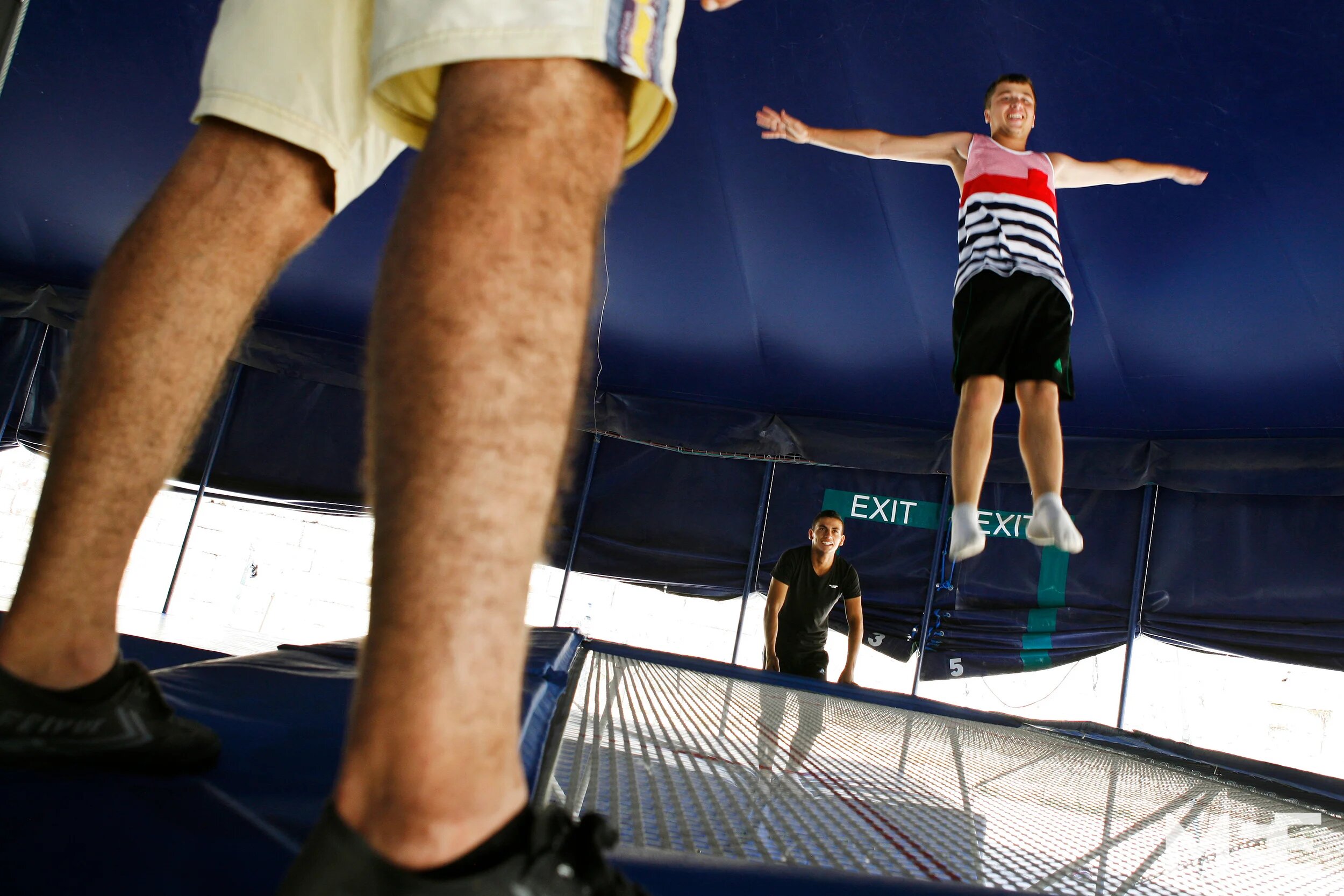 Students exercise on the trampoline. Aside from training in the tent, classes also take place in Jenin, Hebron, Ramallah and Al Fara’ refugee camp. (MEE/Silvia Boarini)
