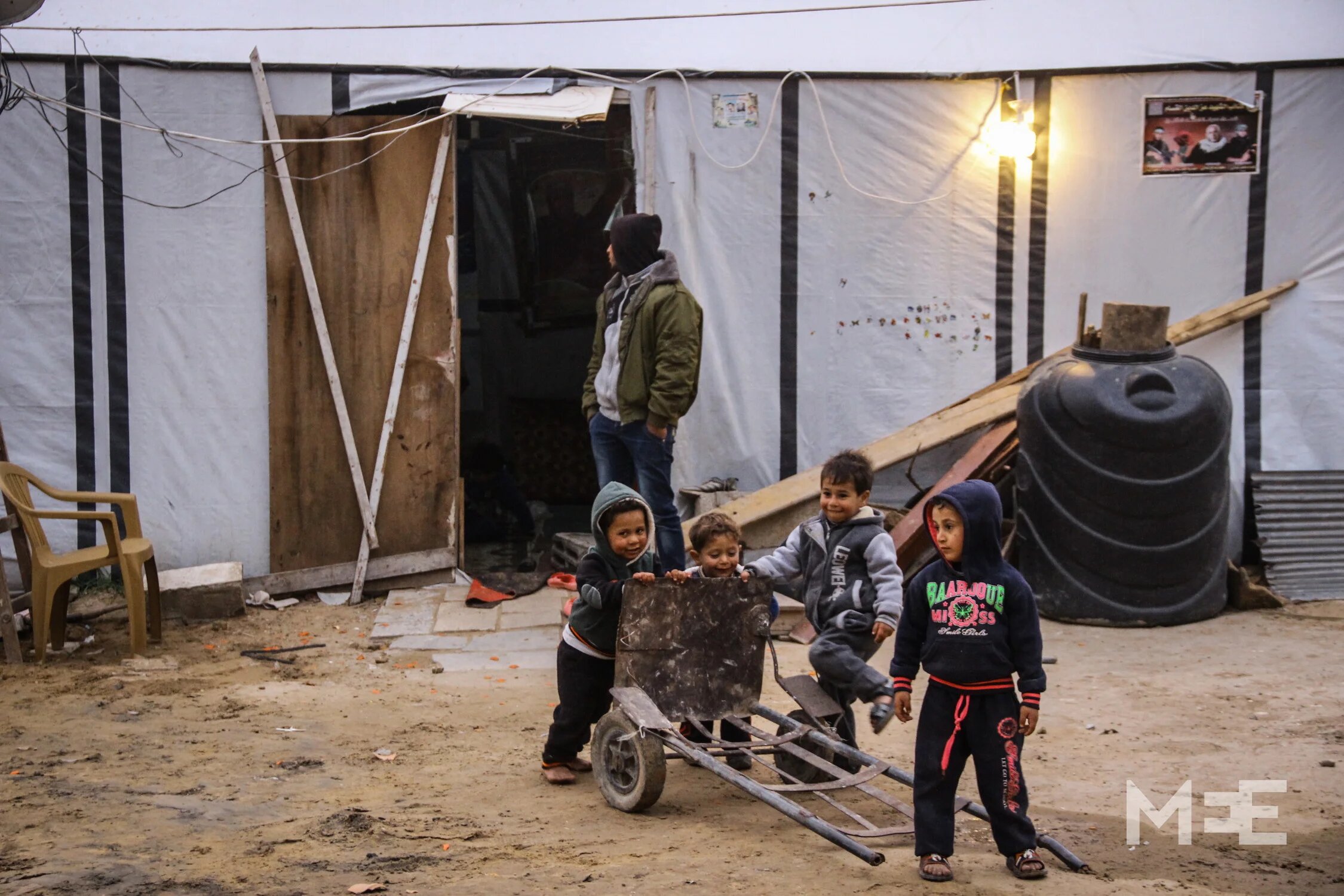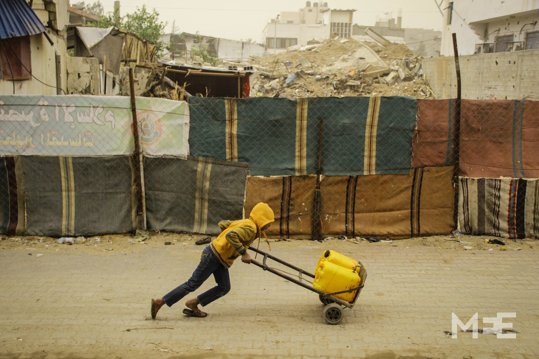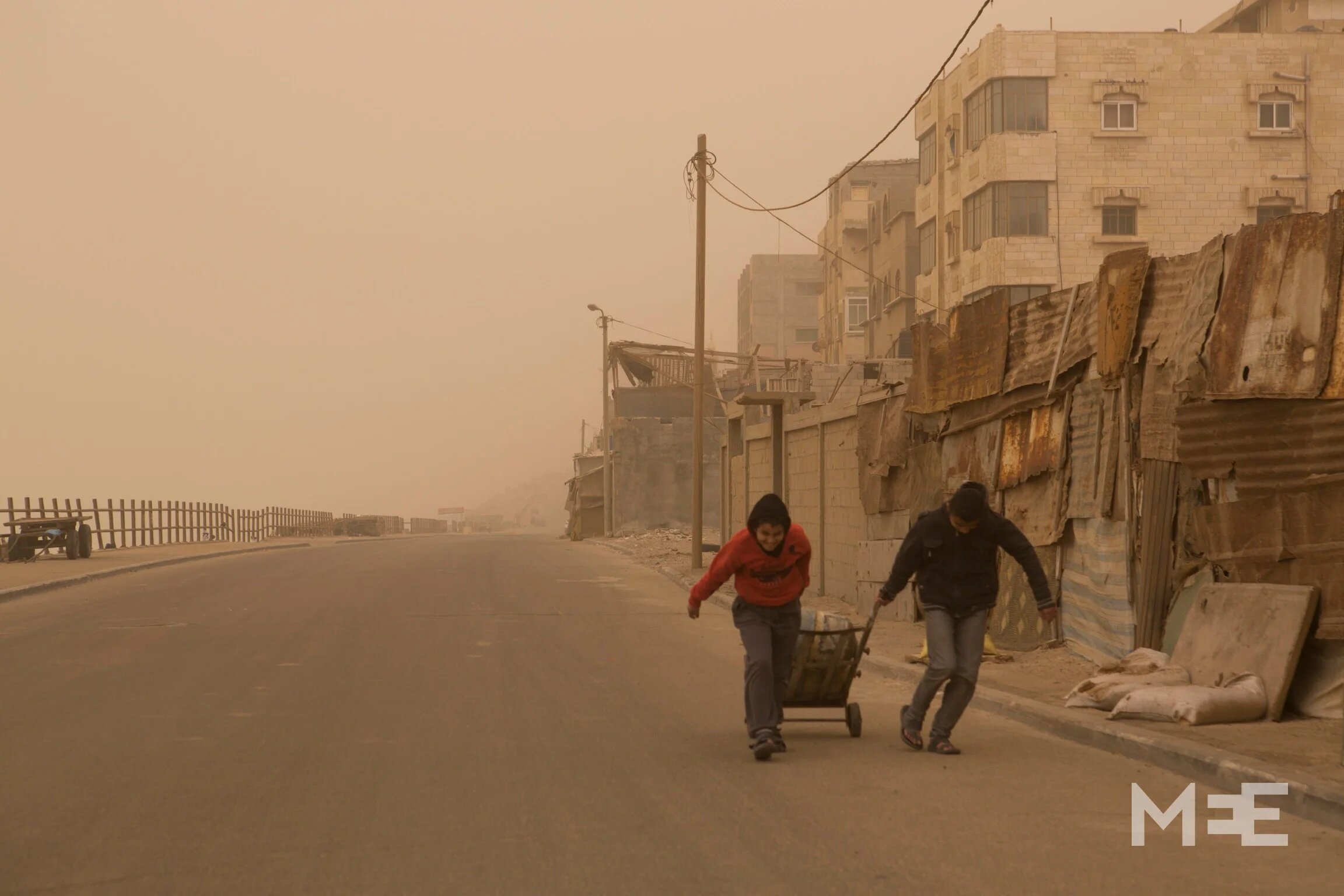 Palestinian children carry a gas bottle during a storm in the Beach Camp of Gaza City (MEE/Anne Paq and Basel Yazouri)
