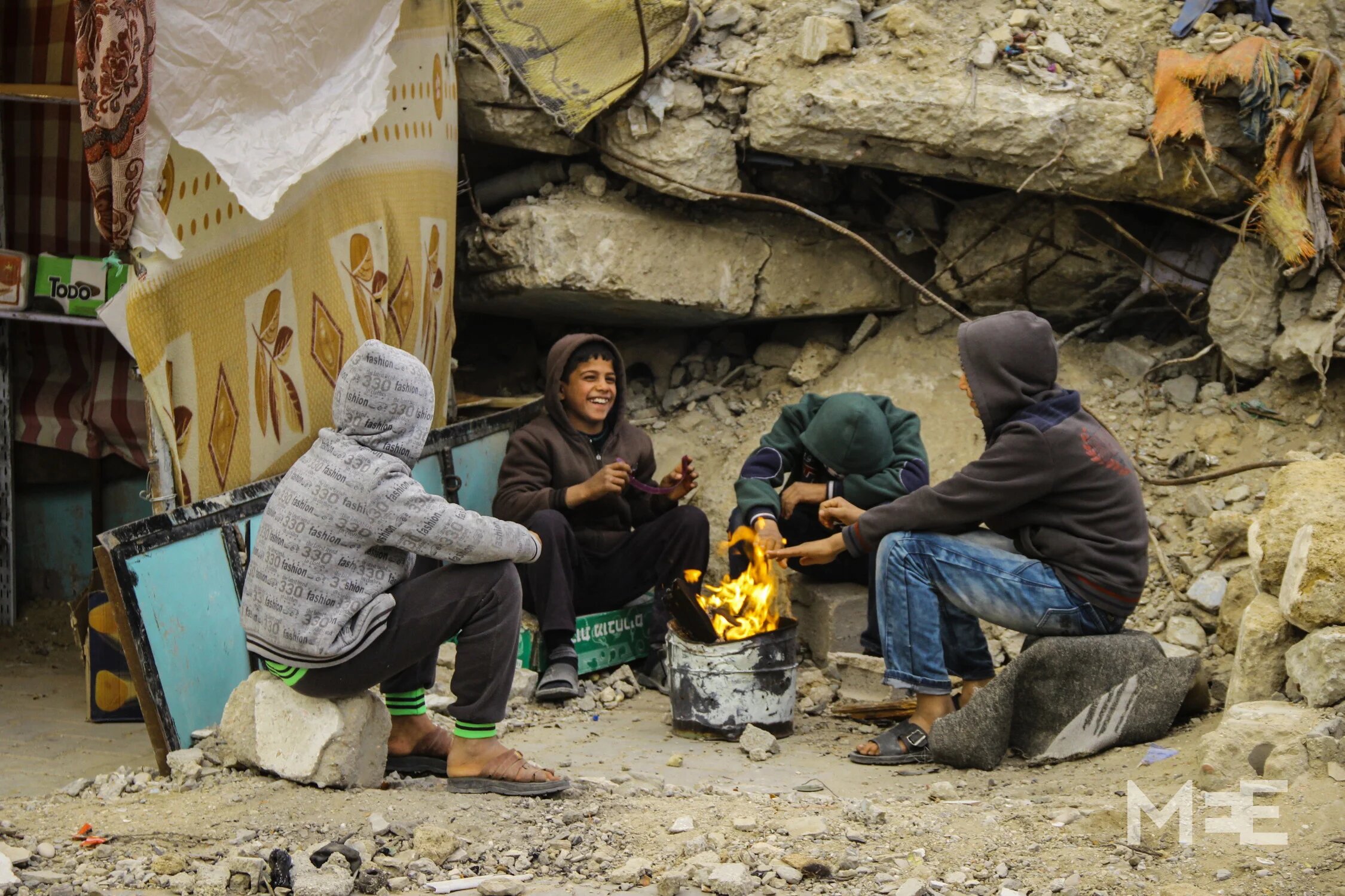 Children try to warm themselves around a fire in one of the destroyed sections of Shujayea, east of Gaza City (MEE/Anne Paq and Basel Yazouri)