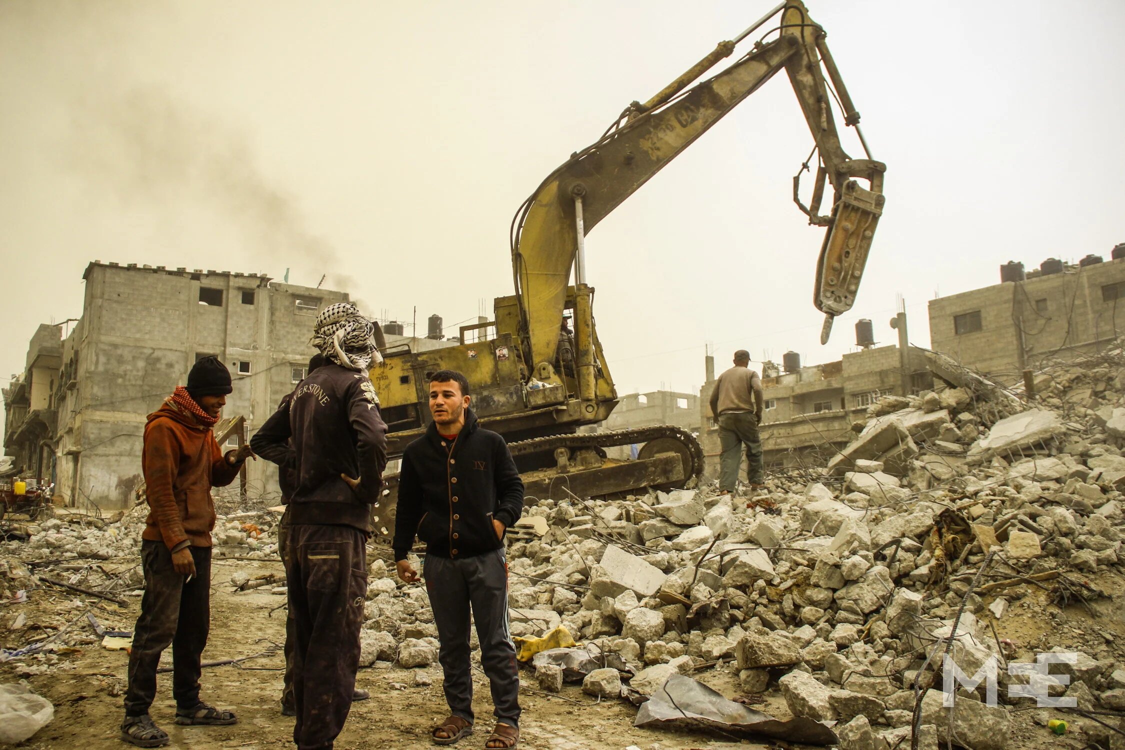 Despite the bad weather conditions, some bulldozers work in Shujaiya to clear the rubble (MEE/Anne Paq and Basel Yazouri)