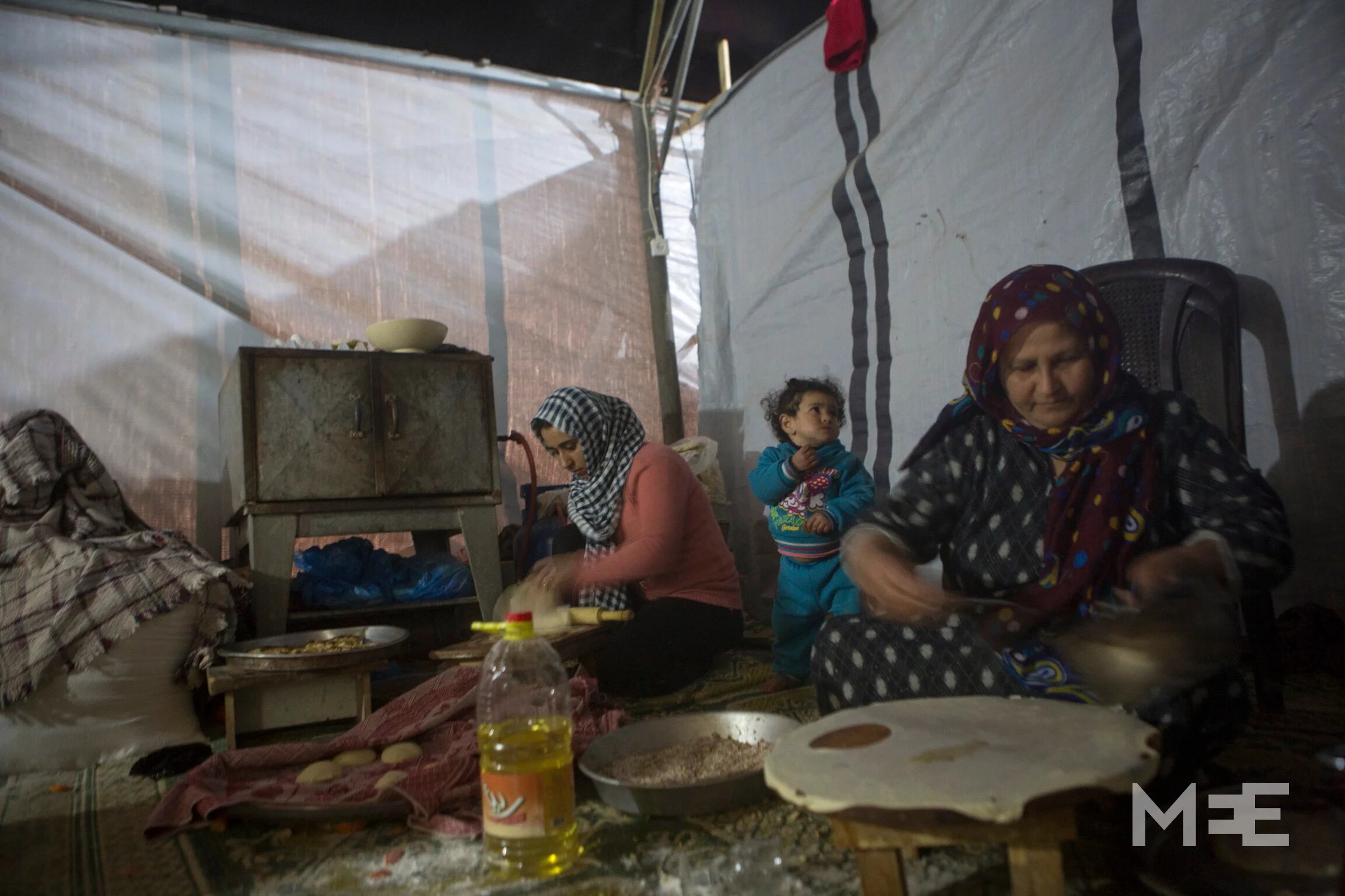 Palestinian women from the Shamali family prepare food in a tent near the destroyed section of Shujayea (MEE/Anne Paq and Basel Yazouri)