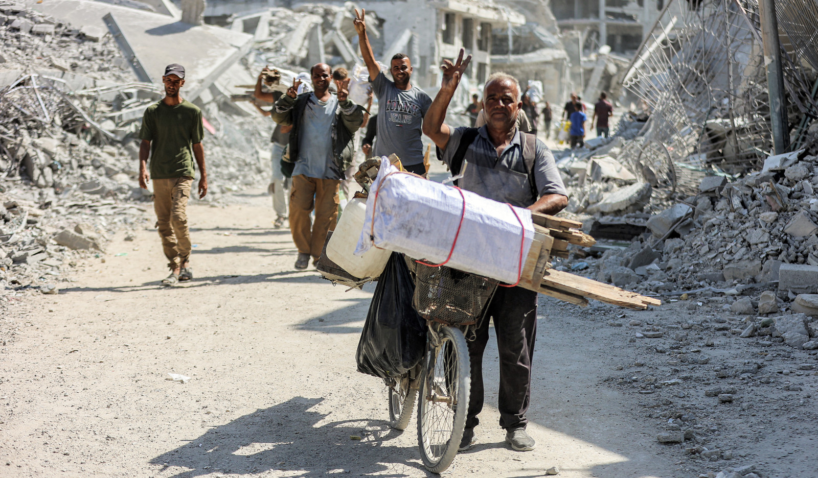 Palestinians, who were displaced to the southern part of Gaza at Israel's expulsion order during the war, walk along a road in the central Gaza Strip as they attempt to return to the north on 10 October 2025 (Mahmoud Issa/Reuters)