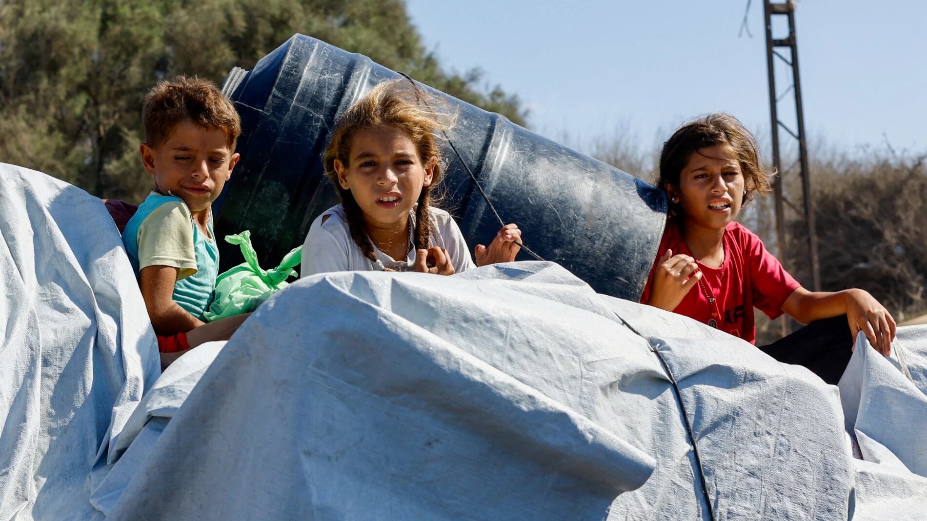 Children sit among belongings as they return with their famlies to the north, 10 October 2025 (Mahmoud Issa/Reuters)