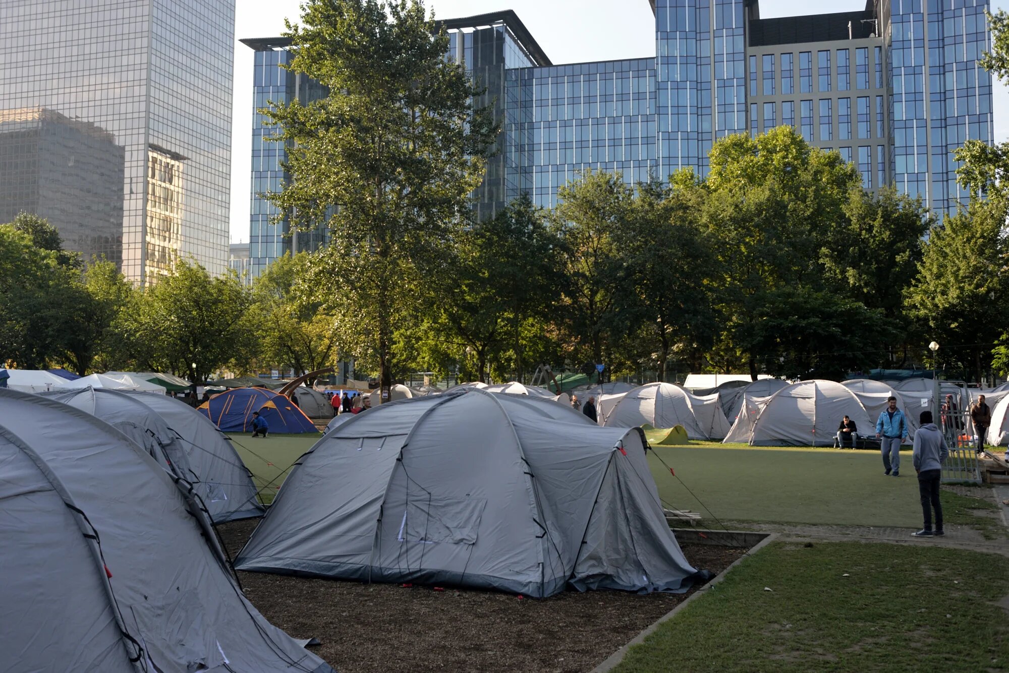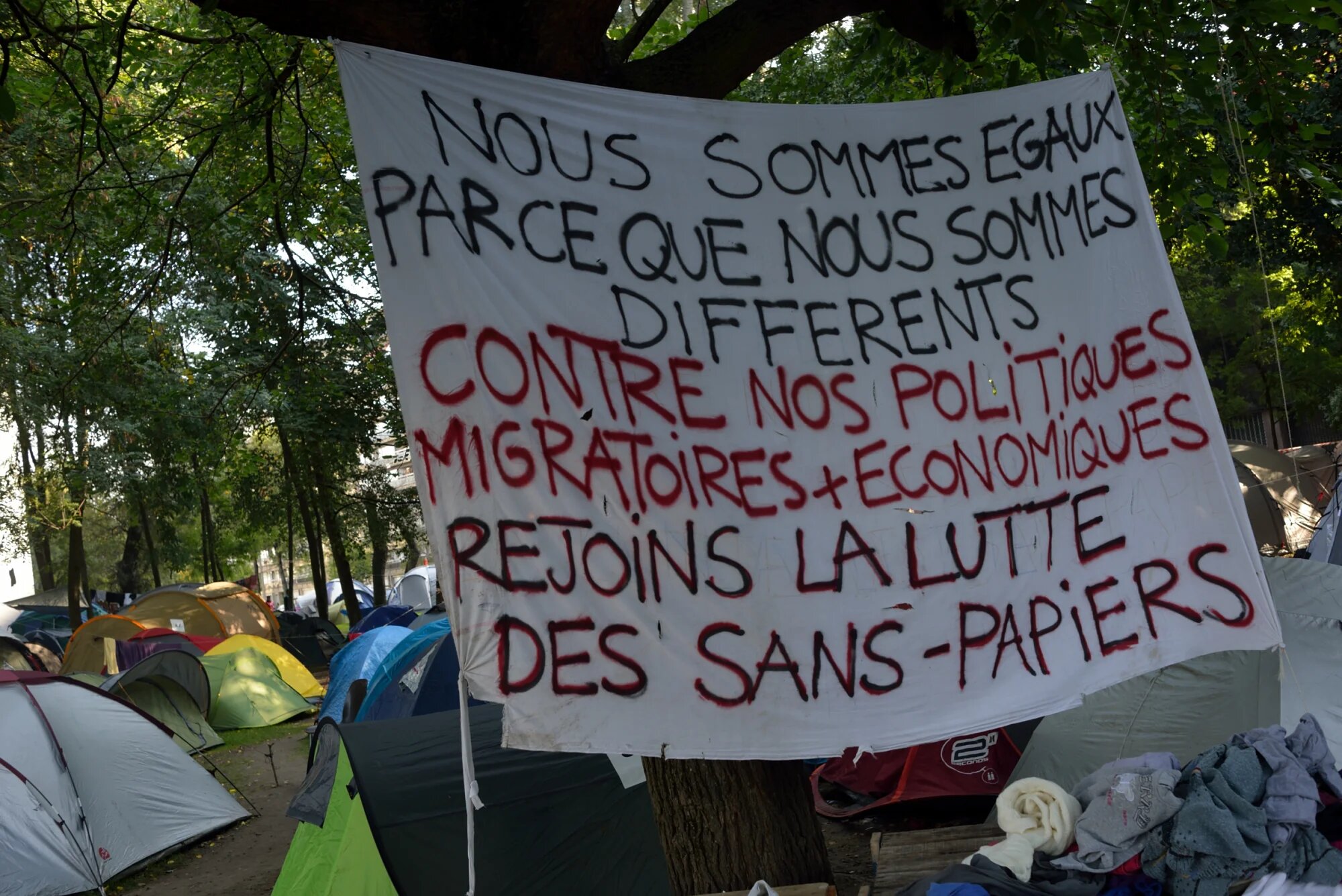 A protest banner at the Maximilien Park tent camp says "We are equal because we are different. Against our migration and economic policies. Join the struggle of the undocumented."