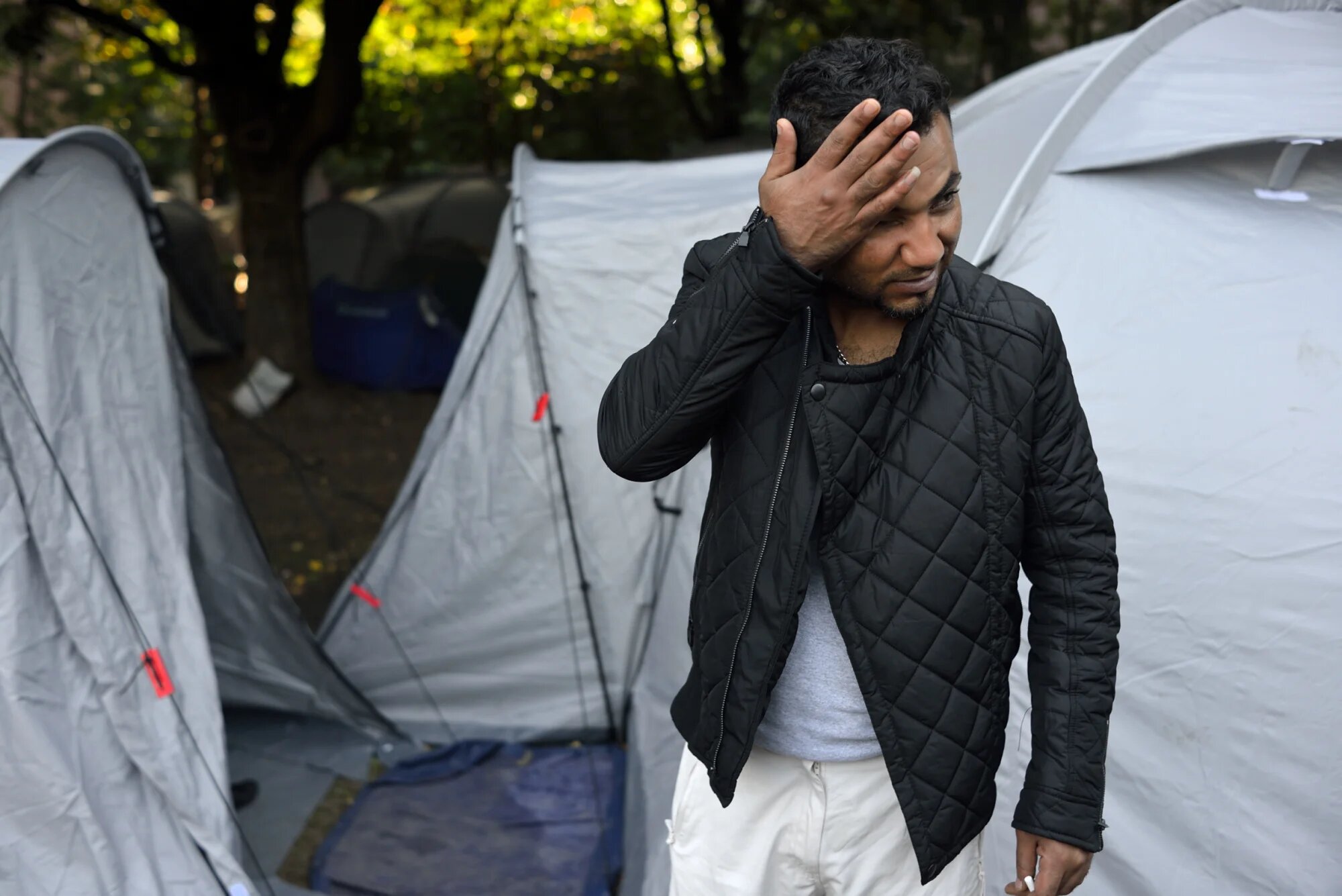 A refugee at the Brussels tent camp wakes up (MEE / Jerzy Wierzbicki)