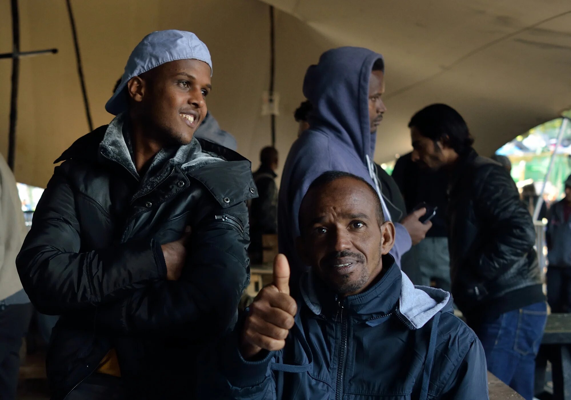 Maximilien Park tent camp residents give the thumbs up (MEE / Jerzy Wierzbicki)