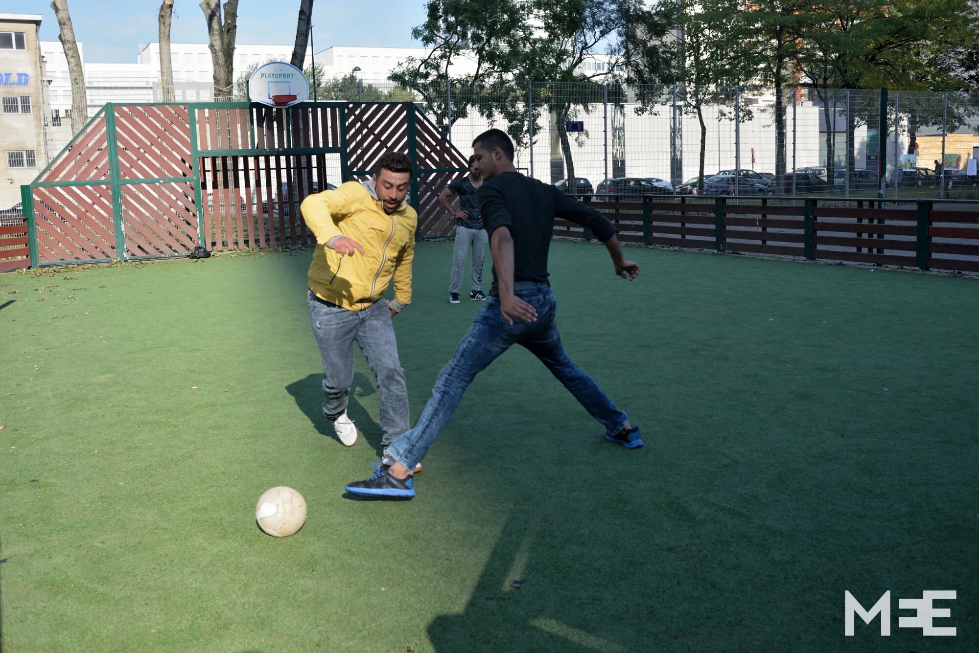 Two tent camp residents play football in Maximilien Park (MEE/ Jerzy Wierzbicki)