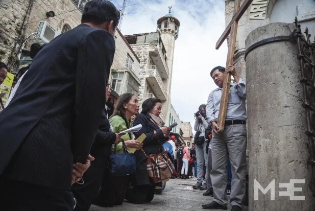 Pilgrims pray during a Good Friday celebration in the Old City of Jerusalem (MEE/Andrea DiCenzo)