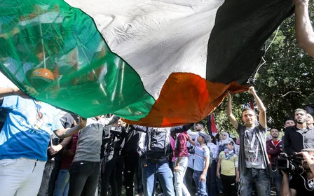 In Amman, Jordan, which has long had a peace treaty with neighbouring Israel, more than 10,000 demonstrators waved the Palestinian flag and marched the streets near the Grand Husseini Mosque in support of Palestinians amid Israeli air strikes on Gaza.