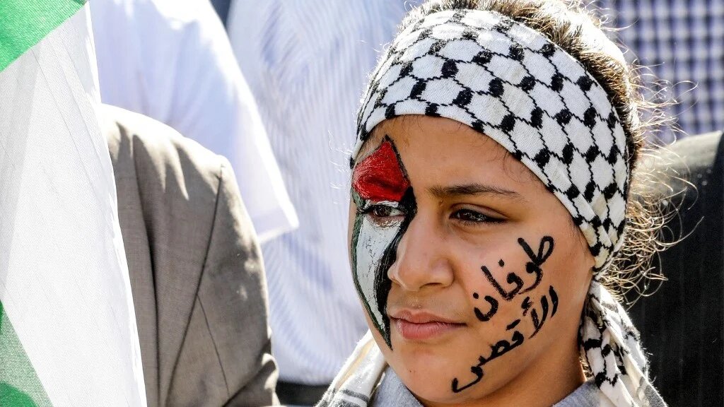A girl wearing facepaint showing the Palestinian flag and the Arabic slogan "Al-Aqsa flood" looks on during a rally in solidarity with the Palestinian people in Damascus, Syria's, central Arnous Square.