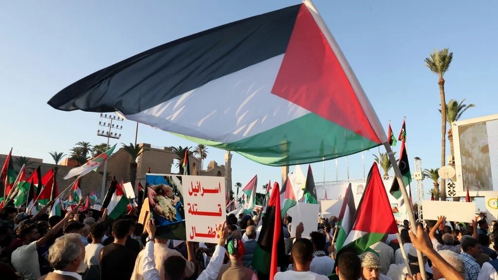 Libyans chant slogans and wave Palestinian and Libyan national flags as they march in solidarity with the people of Palestine in Martyr's Square in the capital Tripoli.