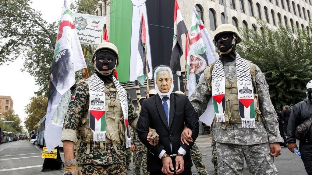 Members of the Iranian Basij forces staged a mock arrest of a man dressed like Israeli Prime Minister Benjamin Netanyahu during a rally to show their solidarity with Palestinians in the capital of Tehran.