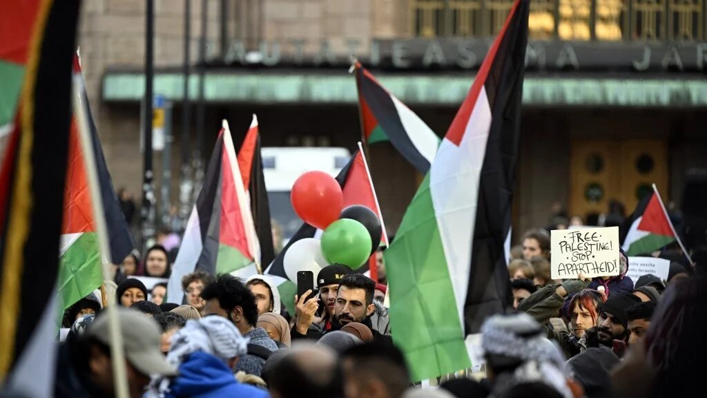 In Helsinki, Finland, protestors participate in a pro-Palestinian demonstration on Friday 13 October.