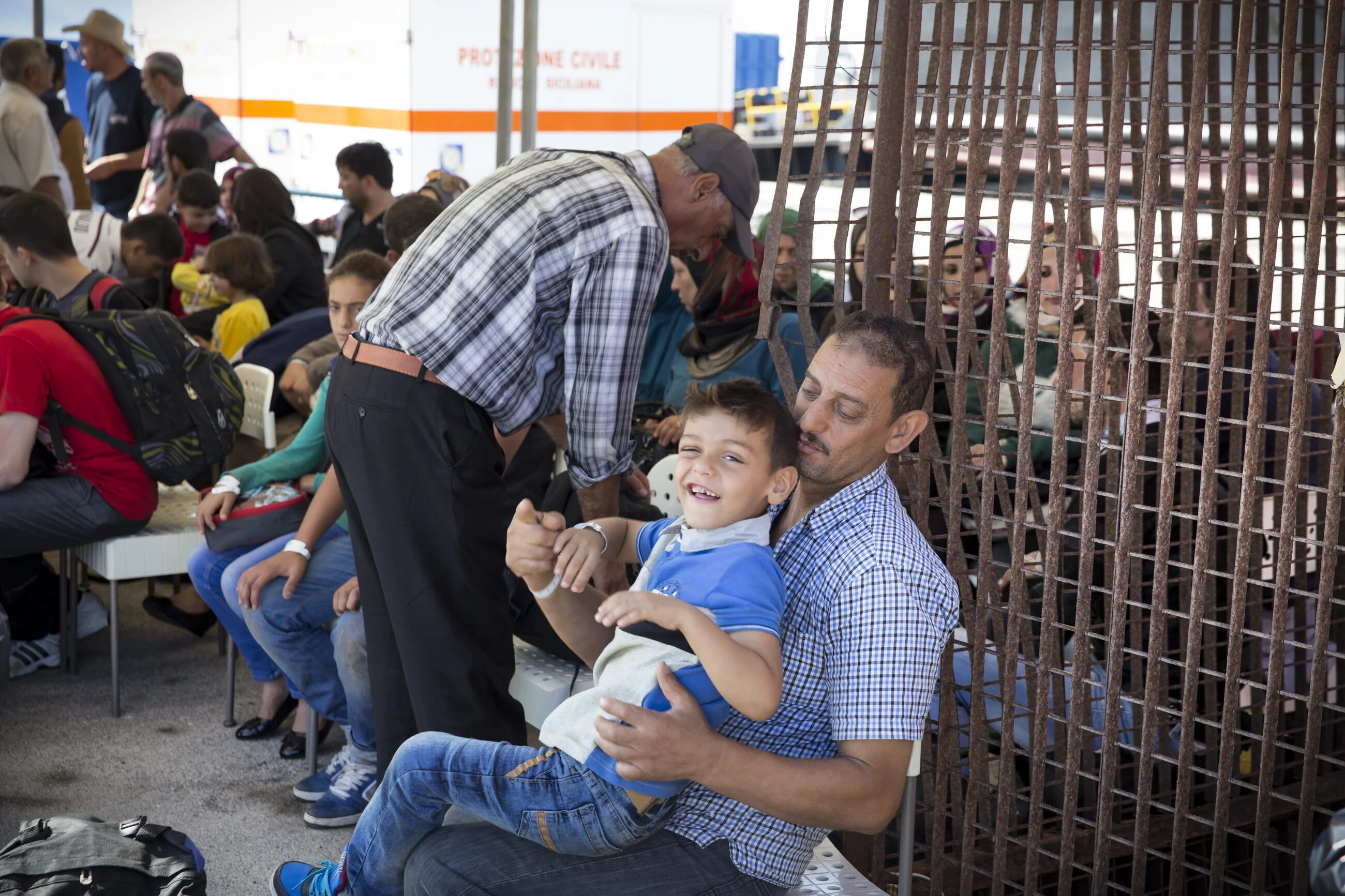 A father and son wait to be processed in the Italian port of Trapani (MEE/ Francesco Bellina)