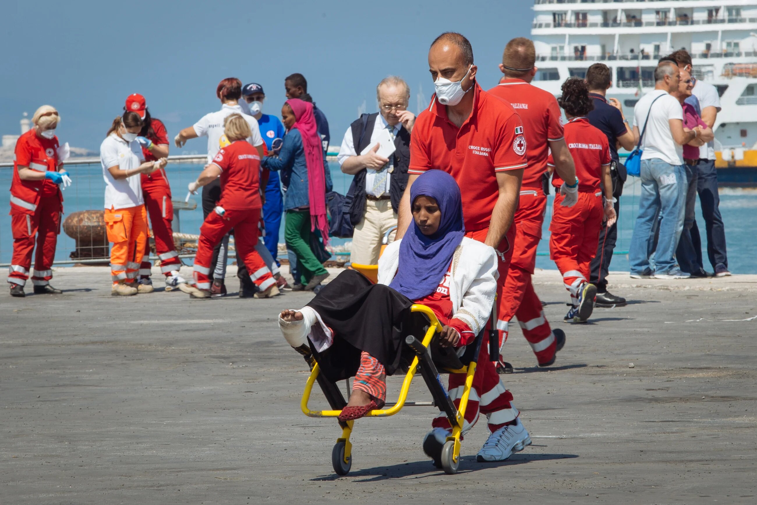 Aid workers help injured woman as she lands in Trapani (MEE/ Francesco Bellina)