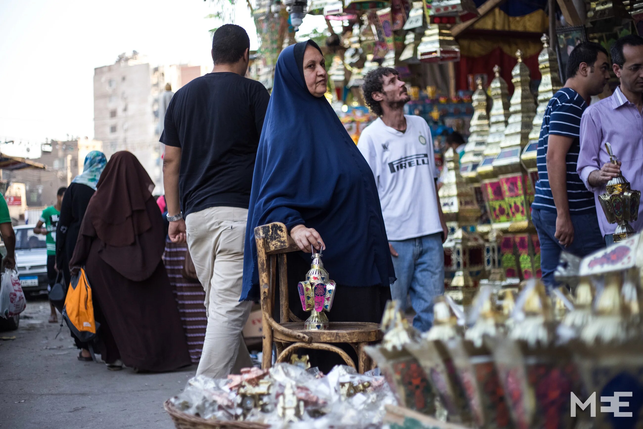 An Egyptian woman, holding a fanous and waiting for the vendor to finish with other customers so that she can start haggling with him about the price of the fanous (MEE/Belal Darder)