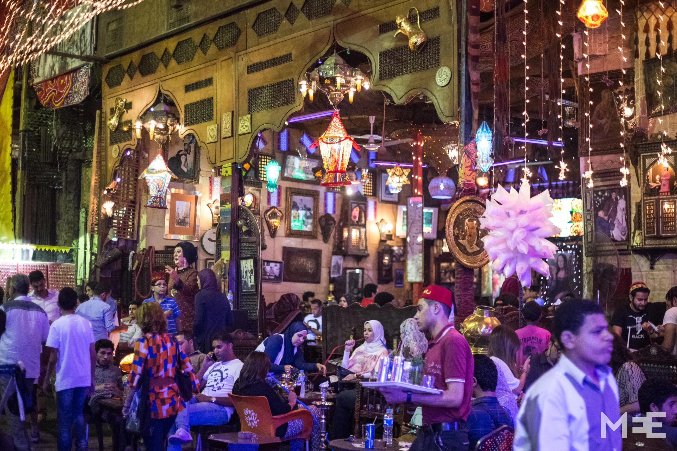An Egyptian cafe on a hot Ramadan night where lots of Egyptians will spend the night smoking Shisha and drinking beverages, while colourful fanous hang decoratively from the ceiling of the cafe (MEE/Belal Darder)