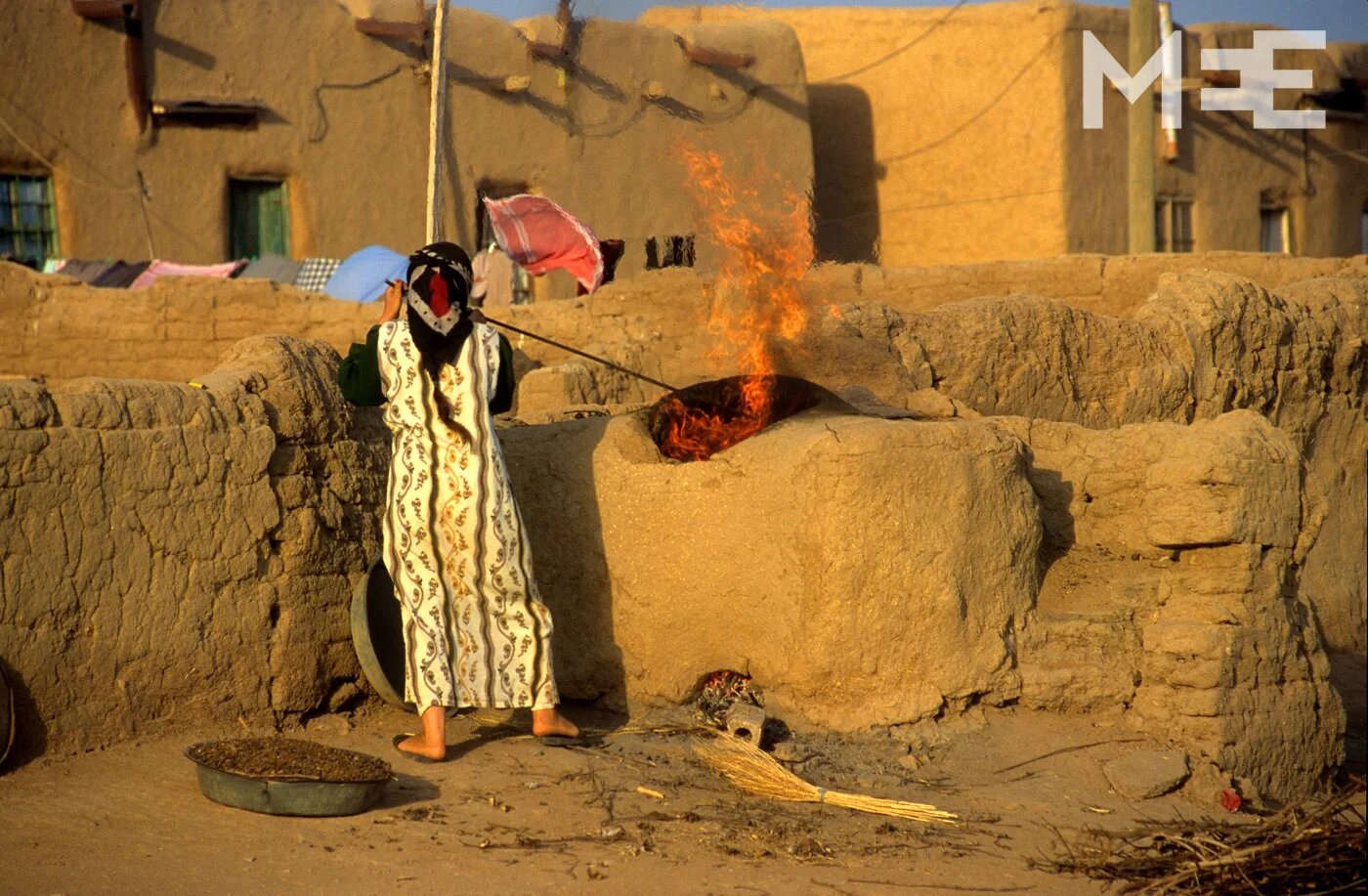 The Kurdish village near Al Qamishly in north-east part of Syria. Women preparing tanur, the bread oven, August 1999
