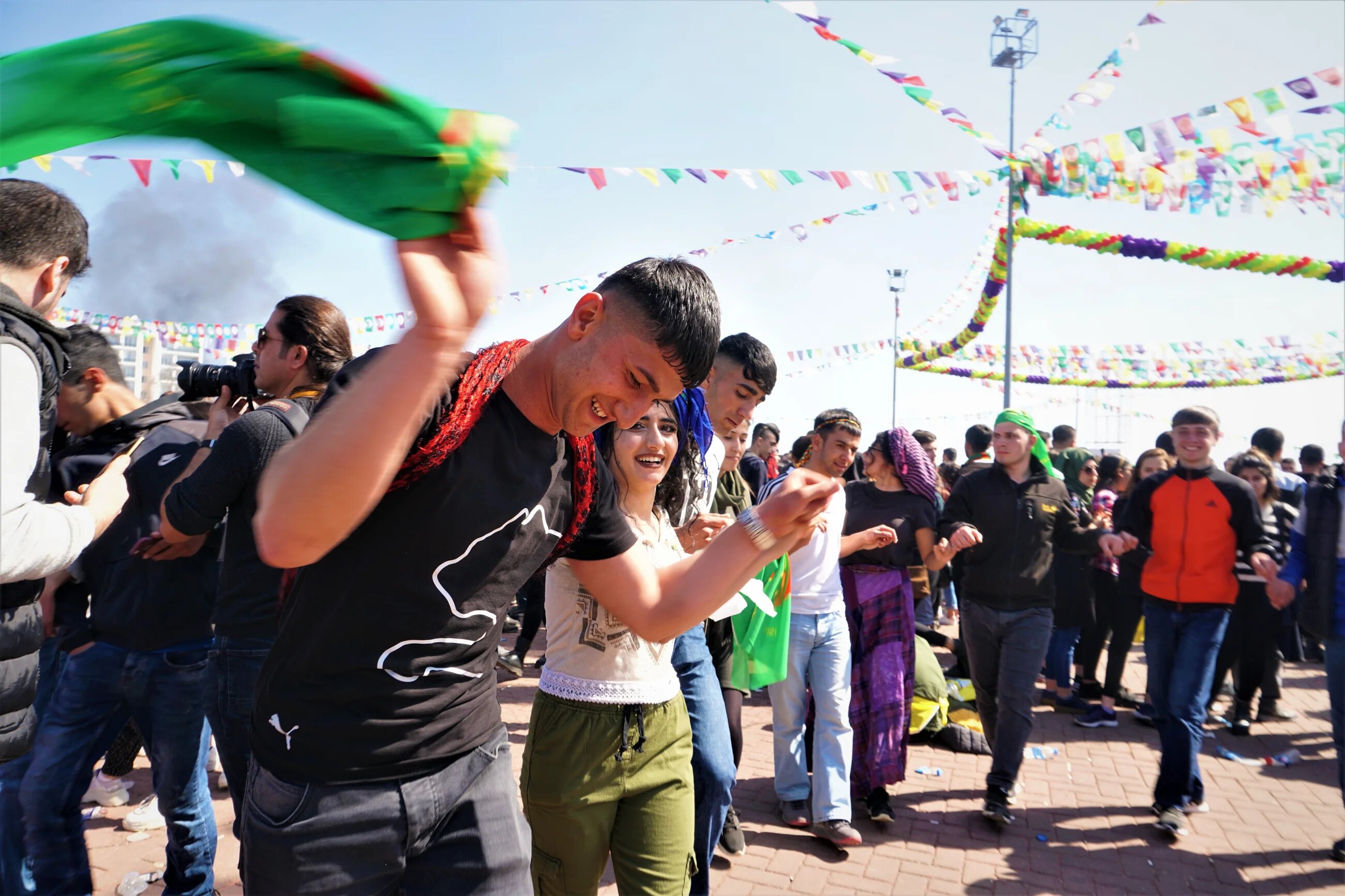 Inside Nowruz Park in central Diyarbakir, children, elderly, men and women danced to folk music, tied by their pinkies to perform the regional halay on Thursday. People also raised flags promoting the pro-Kurdish Peoples’ Democratic Party (HDP), a political party closely affiliated with the PKK. (MEE/Nimet Kirac)