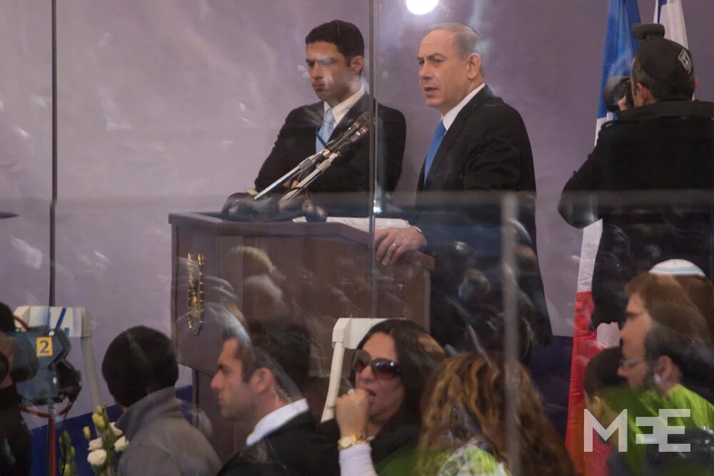 Israeli Prime Minister Benjamin Netanyahu speaks at the state funeral in Jerusalem (MEE/Oren Ziv)