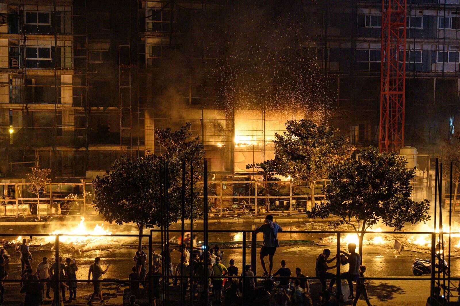 A partly-finished building burns as spectators look on in central Beirut. Work on this site has faced many delays, with the Lebanese property sector stagnant. After several hours the fire burnt itself out (MEE/Finbar Anderson)