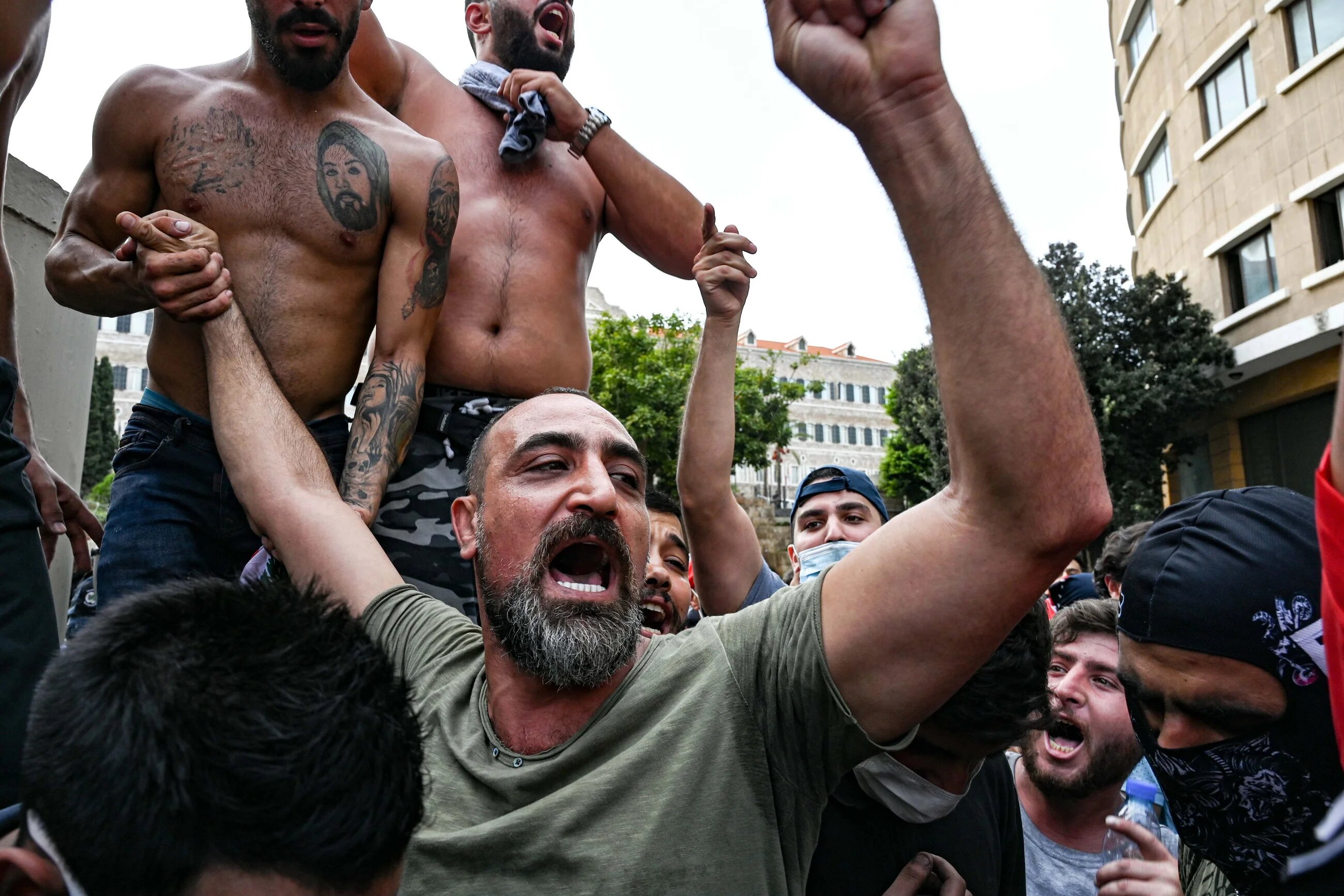 Abdo Chahine leads a chant in front of the Grand Serail (headquarters of the prime minister) building. The Lebanese actor is known for his roles in the movie Film Kteer Kbeer and the popular television drama Al Hayba (MEE/Finbar Anderson)