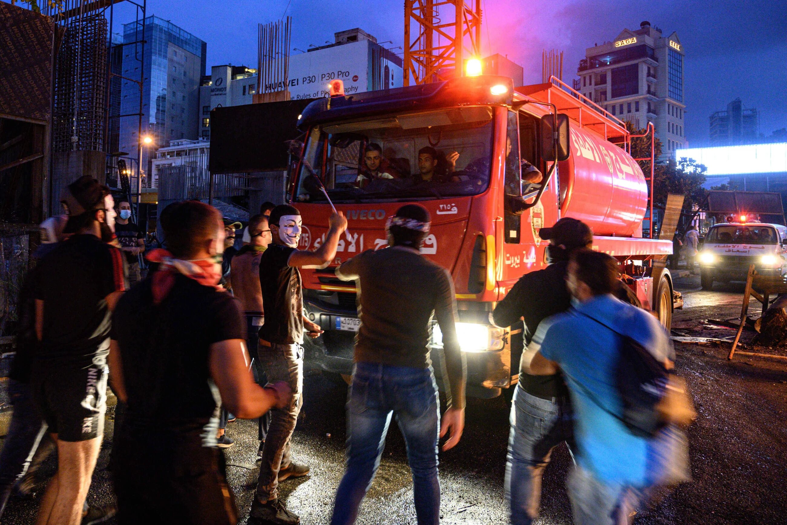 Protesters force fire engines away from a burning building just south of Martyrs' Square. While police vehicles and fire engines have not been allowed access to protester-controlled areas, ambulances have generally been given free movement (MEE/Finbar Anderson)
