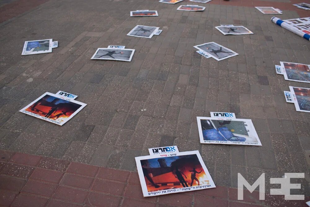 Photos of Palestinian protests strewn on the pavement during the demonstration, attended by a small number of right-wing activists (MEE/Oren Ziv)