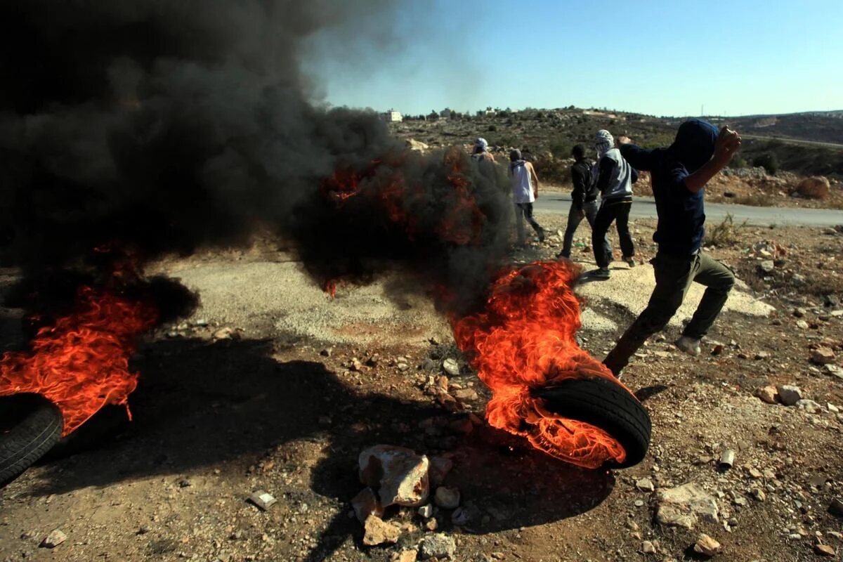 A protester flees from a tyre engulfed in flame in Silwad, east Jerusalem (AA)