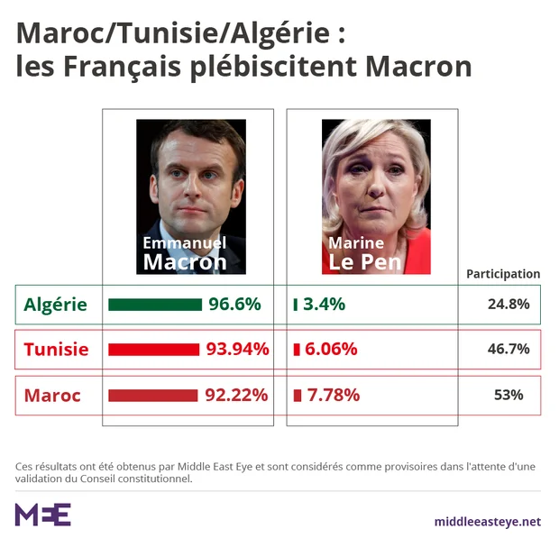 En France, l’immigration maghrébine représentait plus de 8 % de la population en 2011 tandis que l’islam est devenu la seconde religion de France avec près de 5 % de musulmans. Si dans certaines banlieues françaises où de nombreux électeurs ont des origines maghrébines, le vote a plutôt été en faveur de Mélenchon, Macron est souvent arrivé deuxième avec une moyenne de 20/25 % des suffrages, montrant aussi que son discours libéral avait parfois réussi à convaincre même dans les périphéries urbaines défavorisées. Du côté des musulmans qui votent aussi traditionnellement à gauche, Macron a aussi su séduire en réaction au gouvernement de Hollande et surtout aux discours de Manuel Valls durant le quinquennat.