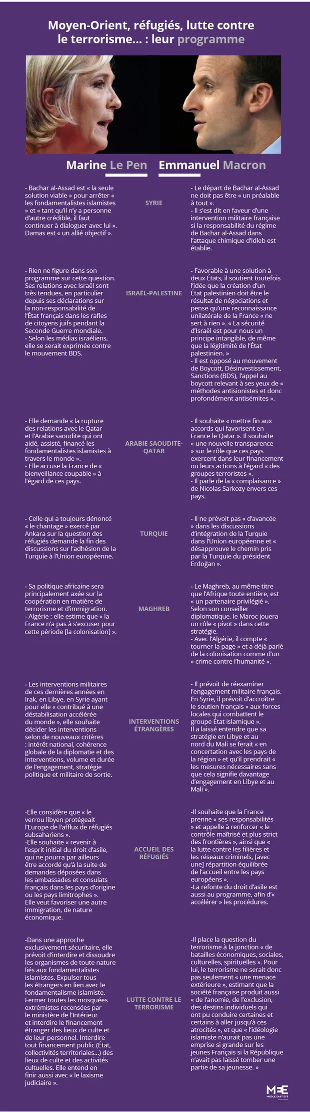 Cela s’applique notamment à la position de la France sur le conflit israélo-palestinien, selon lui : « Nous assistons déjà à un retrait de l’Initiative de paix française proposée en 2016 par François Hollande, donc je pense que tout résultat électoral, que ce soit Le Pen ou Macron, entraînera une altération définitive de l'initiative. »