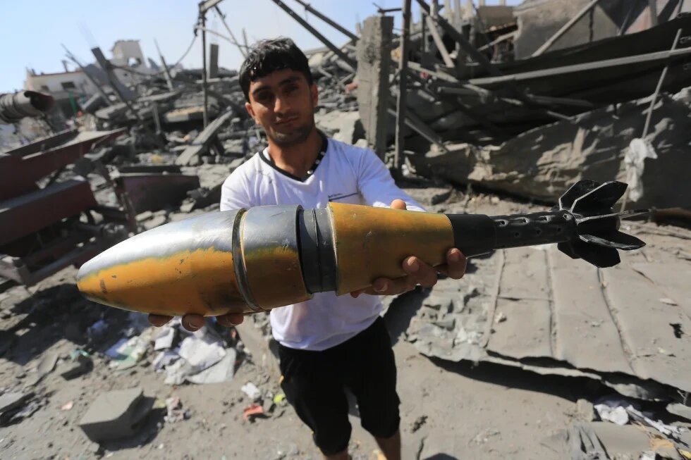 A Palestinian man holding an unexploded ammunition in the Gaza Strip on 1 August, 2014 (MEE/Mohammed Asad)