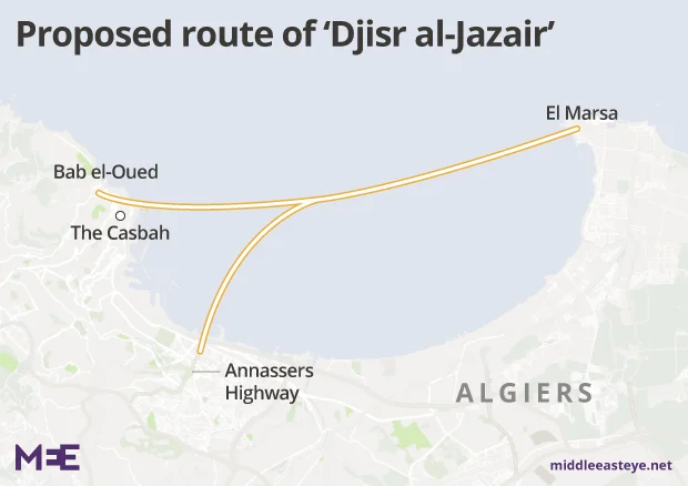 The "Djisr al-Jazair" (Algiers Bridge) would extend out of Bab el-Oued, the French-colonial era neighbourhood just north of the Casbah, toward the middle of the bay. A second span would extend north from the Annassers Highway which links the city’s more recent central coastal sprawl to the populous interior. Both of these spans would arc toward the little fishing port of El Marsa at the eastern edge of the bay.