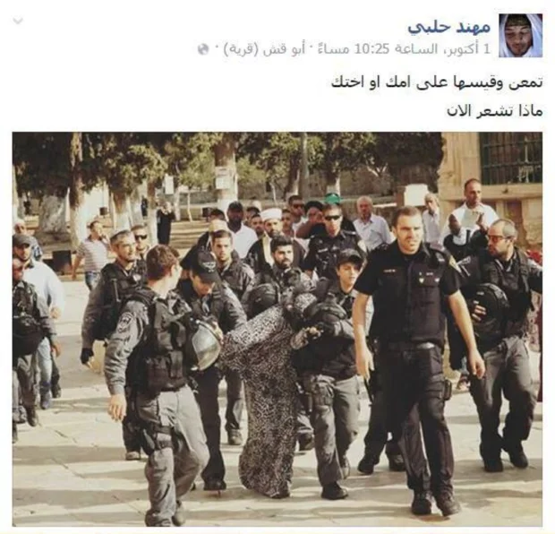 On 1 October, he posted a picture of a Palestinian woman in the grips of Israeli police. It read: "Observe: Look deeply at the picture and think if it was your mother or sister. Think what you feel right now"