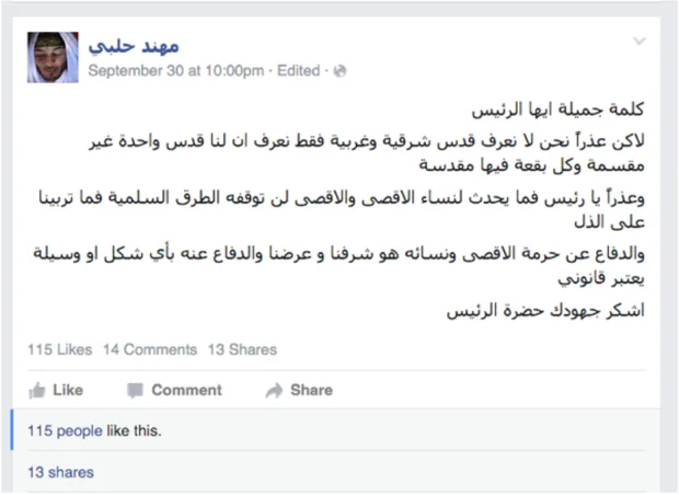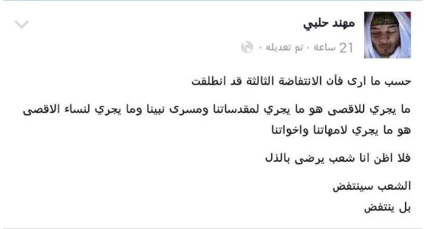 On 2 October, he wrote on his Facebook wall that the Third Intifada has already begun: "I can say that the third intifada began. What is happening at Aqsa is what happening to our mothers and sisters. I don’t think that there is any nation that accepts humiliation. The people are resisting. How long will this humiliation and shame continue?"