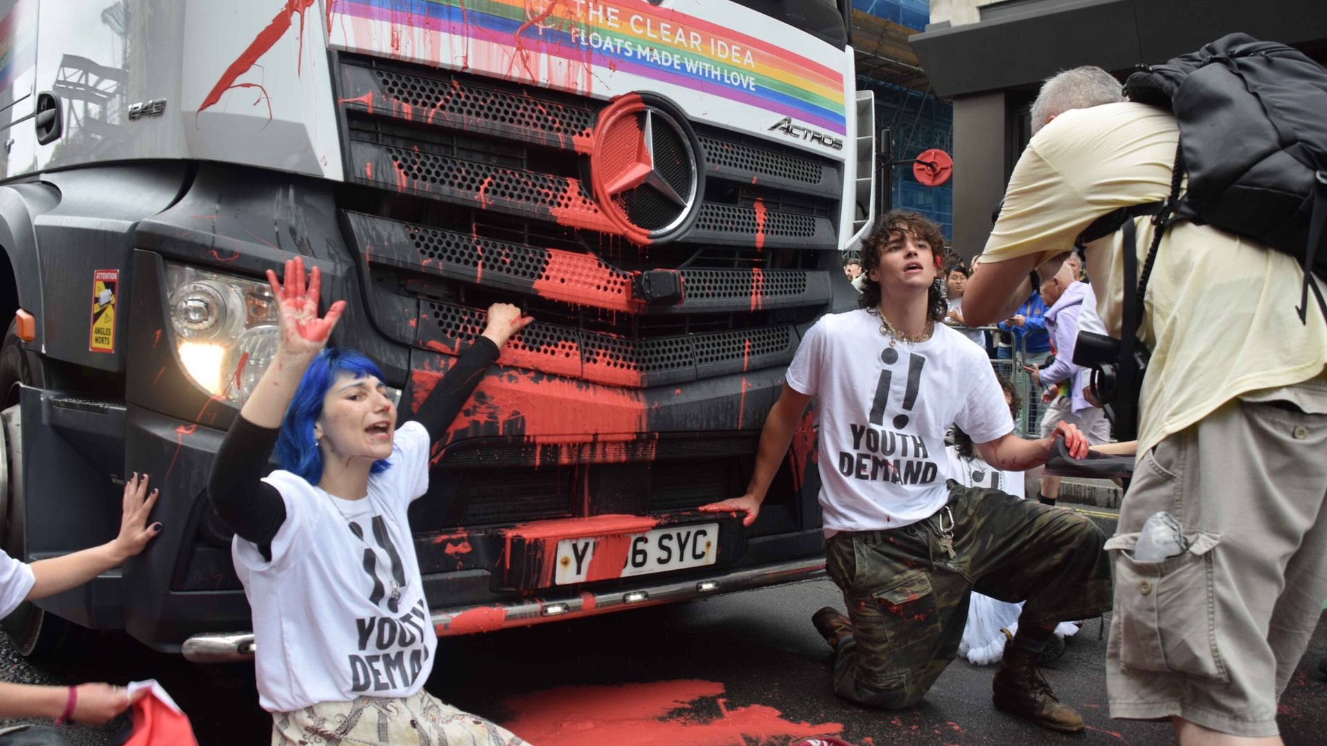 The group threw red paint over the float as it was passing through Piccadilly, before sitting down in the road and glueing themselves to the float, bringing the parade to a halt.