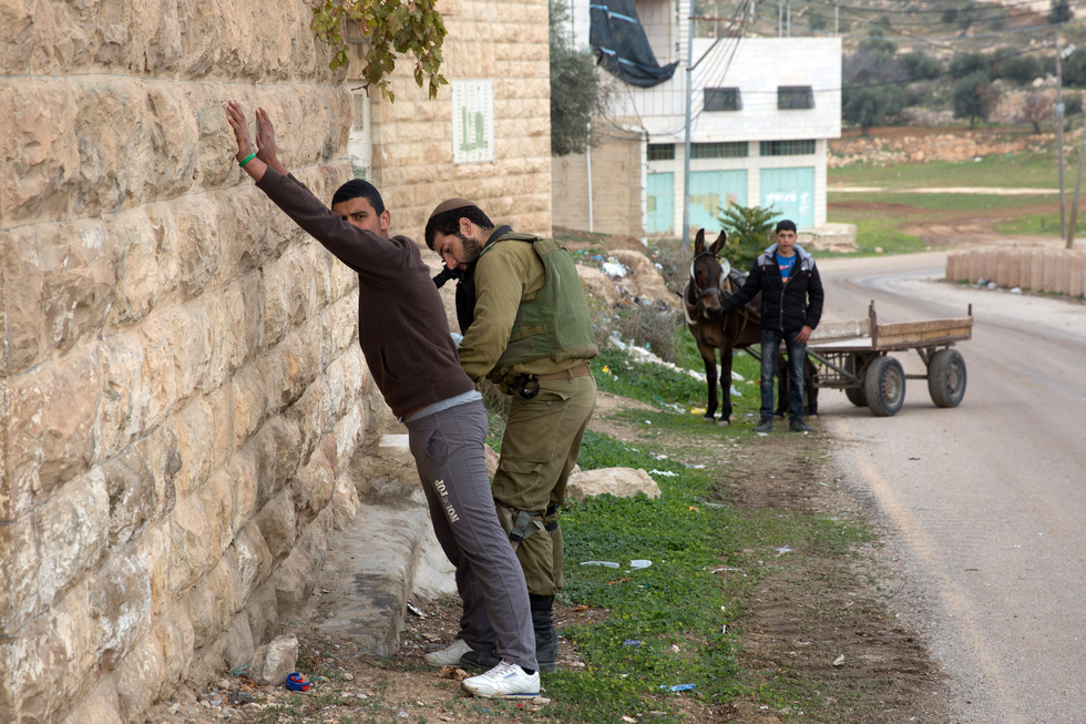 A Palestinian is checked by Israeli soldiers patrolling the streets of the West Bank city of Hebron on 15 December 2015 (AFP)