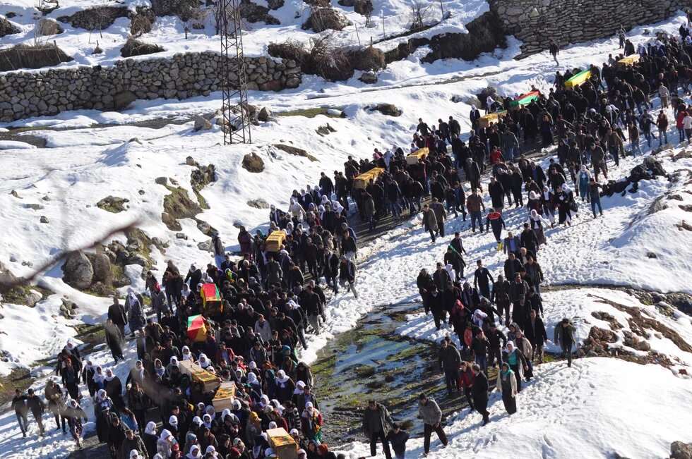 People walk with coffins at a funeral in Sirnak for victims from Cizre and Silopi killed during curfews (AFP)