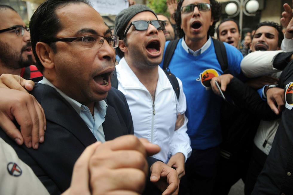 Co-founder of April 6 Ahmed Maher (C) is currently serving a three year prison sentence in Egypt (AFP)