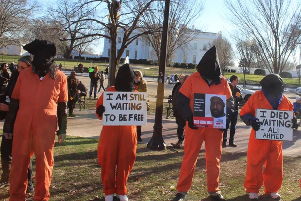 Protesters in orange jumpsuits with black bags covering their heads, symbolising the abuse that Guantanamo prisoners have faced, stood with their backs to the White House as activists and legal experts denounced the continued detention of 40 people at the prison.