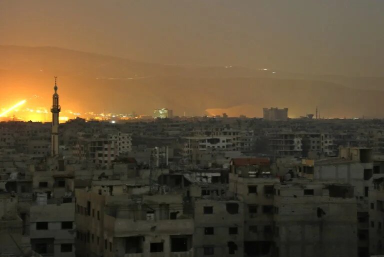 Smoke and flames rising from buildings following a reported Syrian government missile attack on the rebel-held town of Harasta on 4 March (AFP)