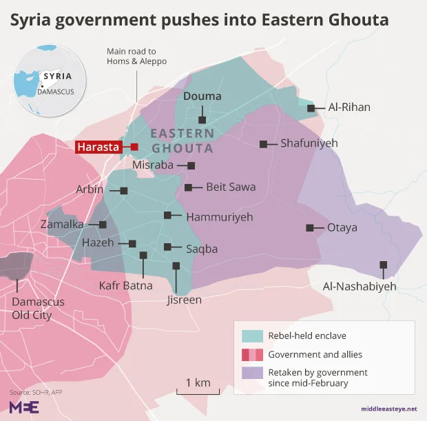 According to activists in Eastern Ghouta, the families under siege in Harasta include locals as well as hundreds of internally displaced families who were forced to leave their homes in the towns of Mudeira and Misraba as government forces captured those areas over the weekend.