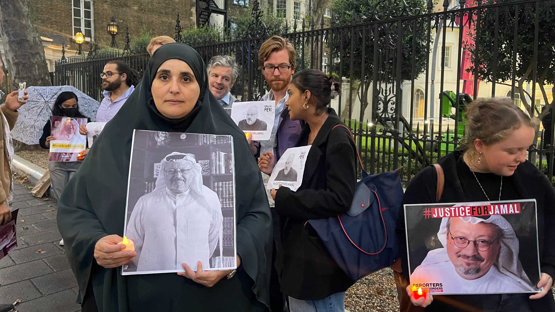 Activists and human rights campaigners gathered outside Saudi Arabia's embassy in London on a rainy Monday evening to mark five years since the murder of journalist Jamal Khashoggi.