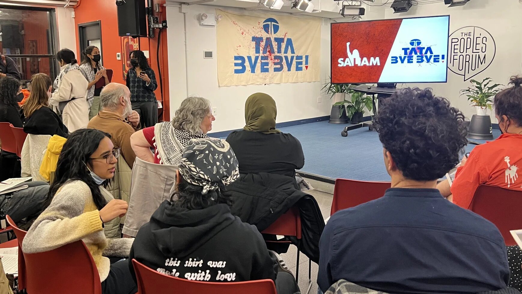 More than 50 people attended the launch of the "Tata Bye Bye" campaign on Thursday evening at the People's Forum in Manhattan.